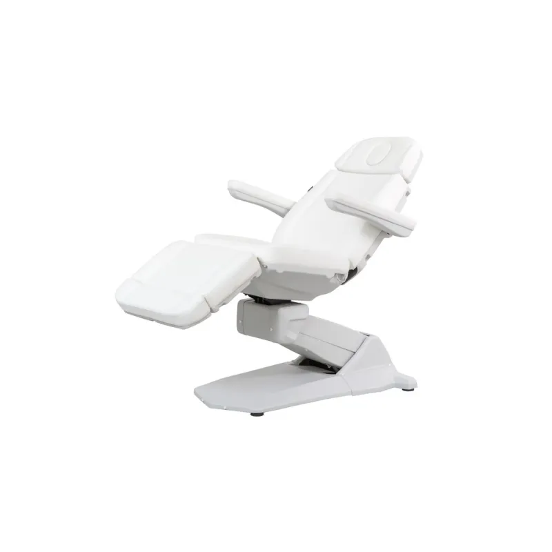 Elektrische Kosmetikliege mit ergonomischem Design und extra stabiler Struktur, ausgestattet mit 4 Motoren zur Verstellung von Höhe, Rückenlehne, Sitzfläche und Fußstütze. Integriertes Heizsystem mit zwei Temperaturstufen und automatischer Abschaltung. 180° drehbare Armlehnen, verlängerbare Kopfstütze und Fußstütze für bessere Anpassung an den Kunden. Hochwertiger weißer PU-Bezug, widerstandsfähig und leicht zu reinigen.