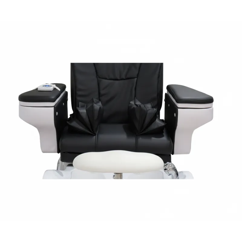 SPA-Pediküresessel mit komfortablem und elegantem Design und hochwertigem weißen PU-Bezug. Ausgestattet mit 2 Motoren zur Regulierung der Rückenlehnenneigung und der Sitzbewegung. Drehbare Armlehnen erleichtern den Zugang und enthalten eine integrierte Maniküreschale. Shiatsu-Rückenmassage und Luftdruckmassage im Sitz. Fußbad mit Hydromassage und Dusche sowie höhenverstellbare Fußstütze. Mit MP3-Player, USB- und SD-Kartenanschluss.