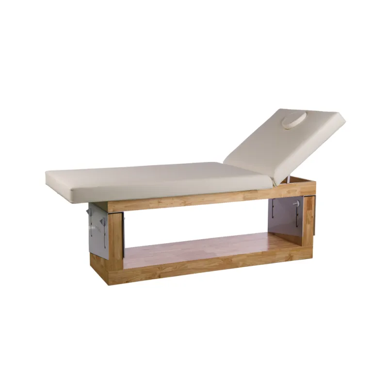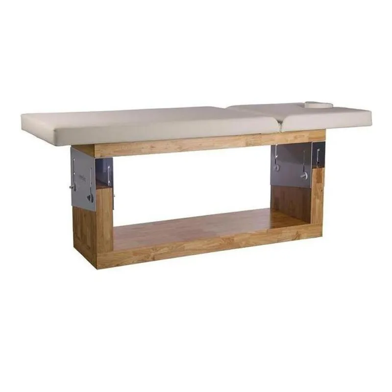 Feste Massageliege mit 2 Sektionen und minimalistischem Design, aus hochwertigem Naturholz gefertigt. Innovatives Höhenverstellsystem mit drei voreingestellten Positionen und manueller Rückenlehnenverstellung in drei Positionen. Komfortable Polsterung mit weißem PU-Bezug in hoher Qualität, leicht zu reinigen.