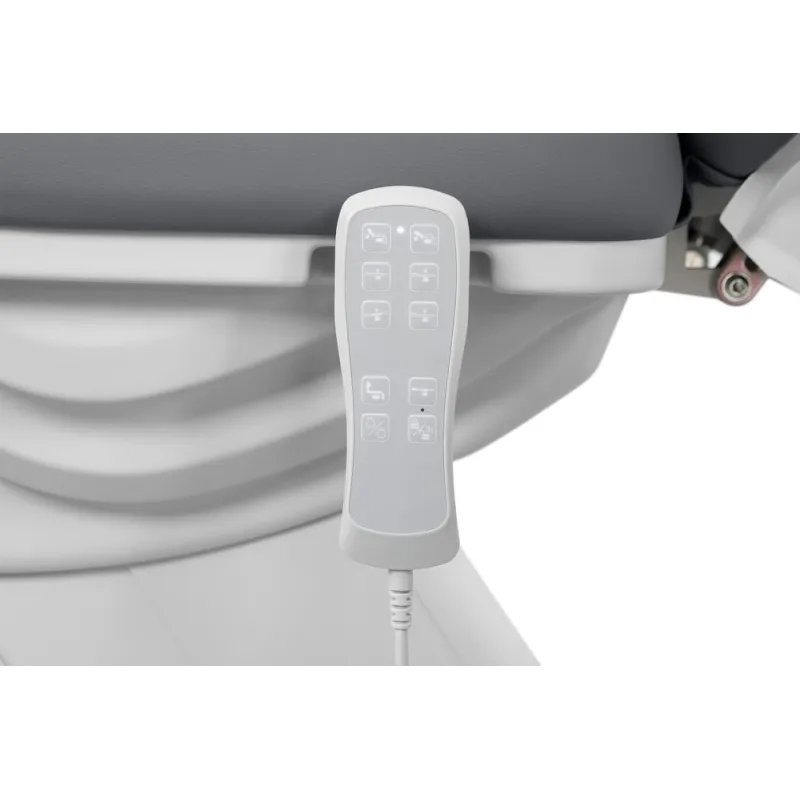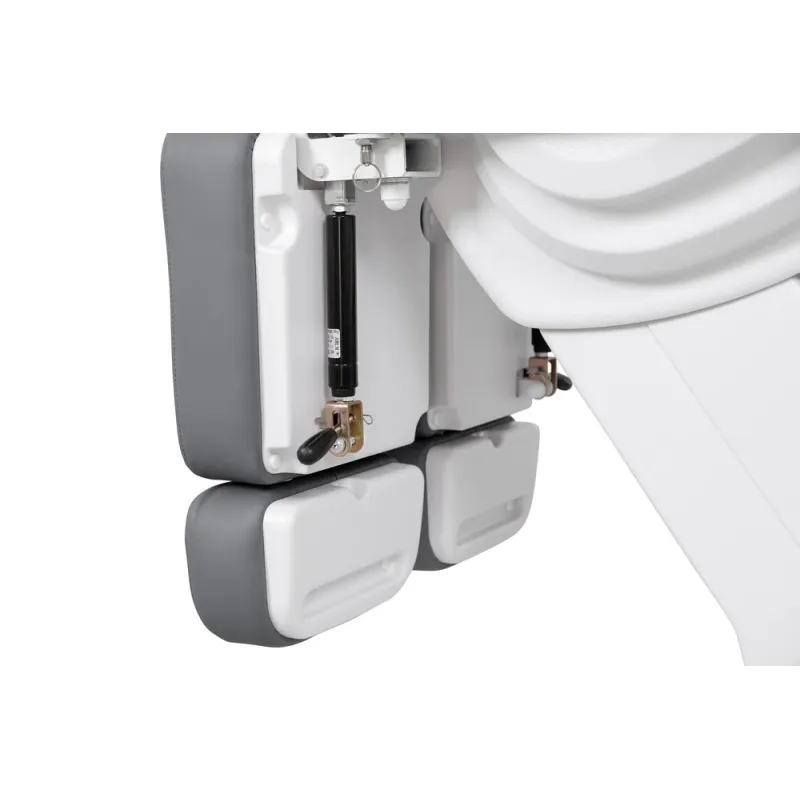 Podologiestuhl mit 3 Motoren, die Höhe, Rückenlehnenneigung und Sitz steuern. Fußstützen unabhängig in der Höhe verstellbar mit Gasdruckfeder. Klappbare Armlehnen und verstellbare Kopfstütze mit Gesichtsausschnitt. Weiße PU-Polsterung von hoher Qualität und leicht zu reinigen.