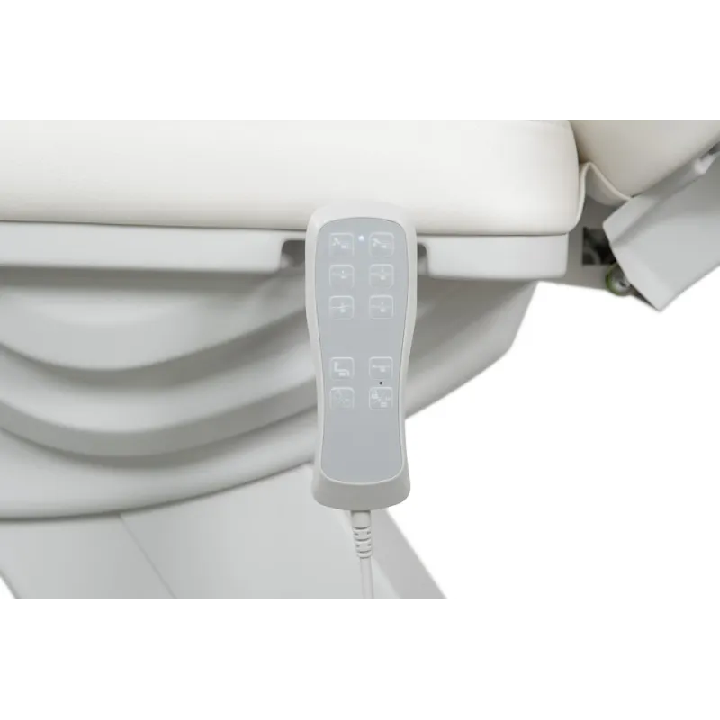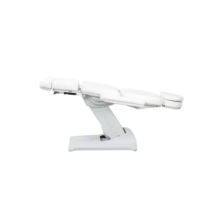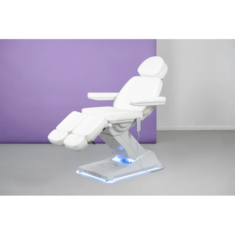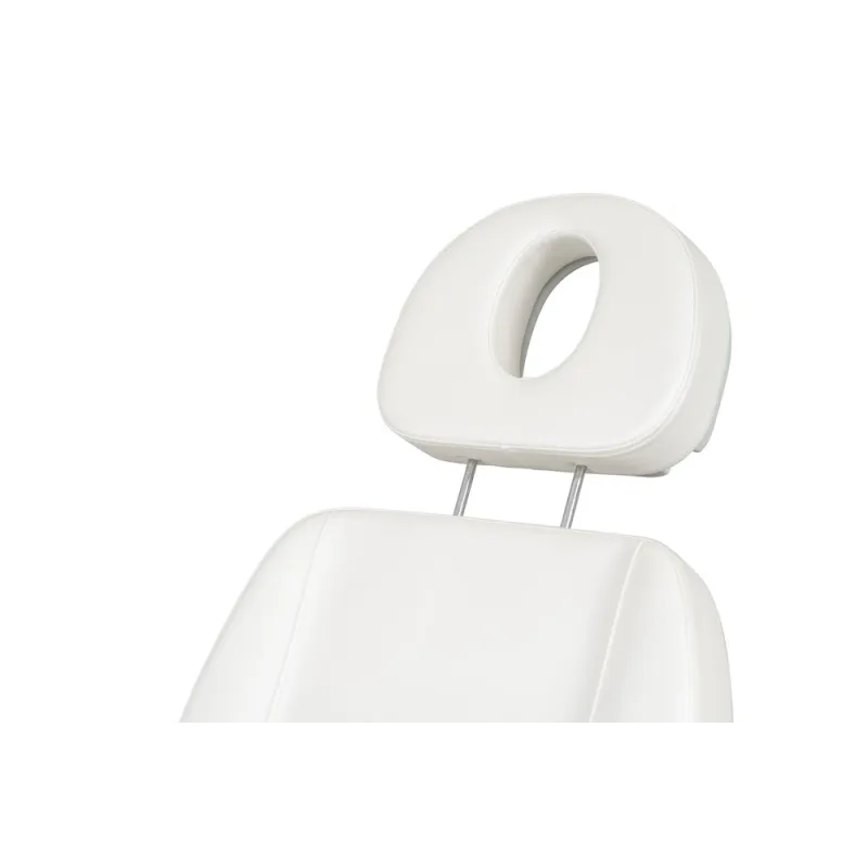Podologiestuhl mit 3 Motoren, die Höhe, Rückenlehnenneigung und Sitz steuern. Fußstützen unabhängig in der Höhe verstellbar mit Gasdruckfeder. Klappbare Armlehnen und verstellbare Kopfstütze mit Gesichtsausschnitt. Weiße PU-Polsterung von hoher Qualität und leicht zu reinigen.