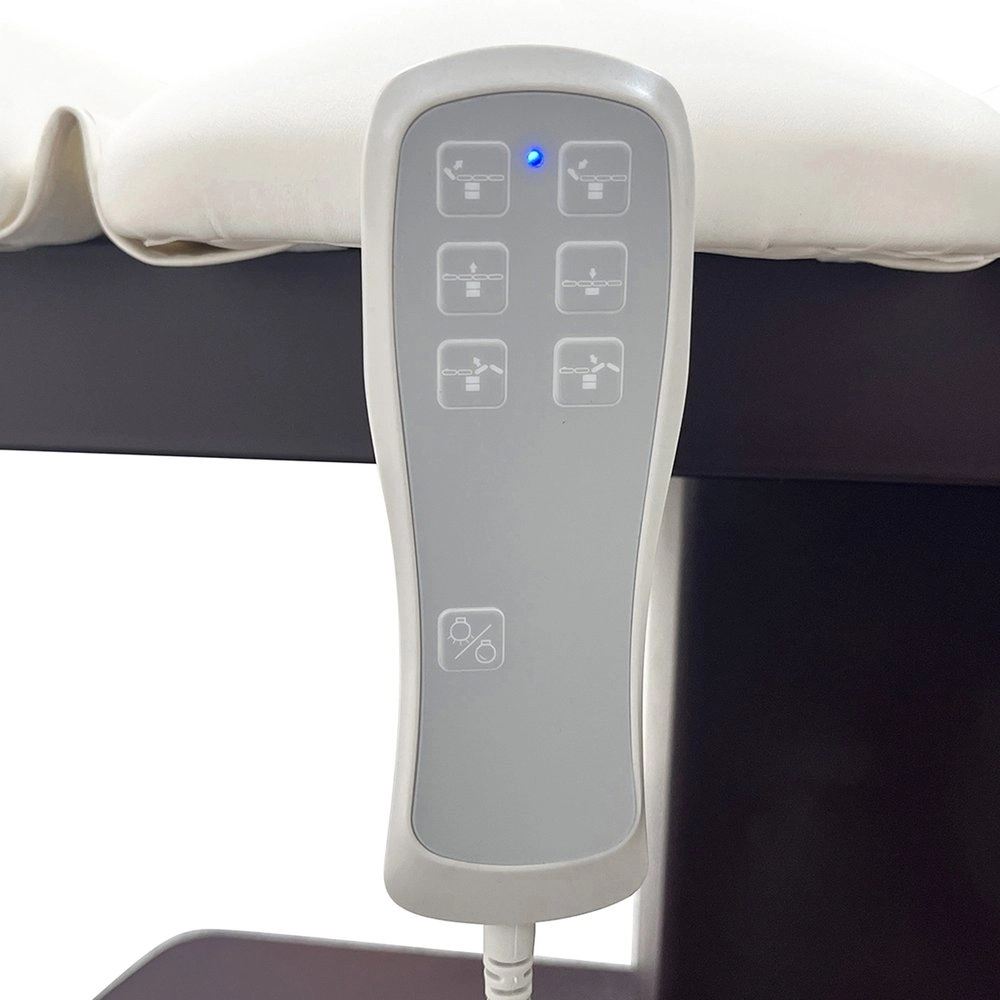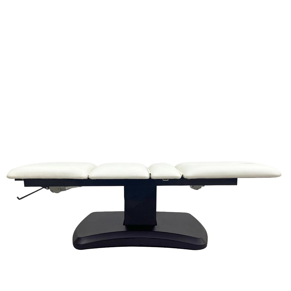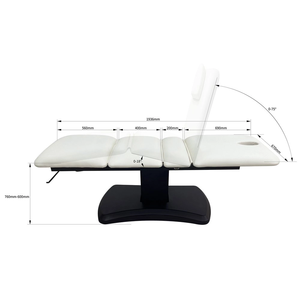 Elektrische Einstellung von Höhe, Rückenlehne und Fußstütze, entworfen, um maximalen Komfort und Effizienz in der Kabine zu bieten. Matratze mit 3 Teilen und Stopfen für Gesichtsöffnung, die eine präzise Anpassung an jede Behandlung erleichtert und die tägliche Arbeit optimiert. Steuerung über Handbedienung. Bezogen mit PU, mit hochdichtem Schaumstoff und einer braunen Basis, die mit weißem Licht-LED ausgestattet ist, um eine entspannende Atmosphäre zu schaffen.
