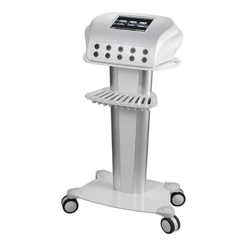 Digitales Elektrotherapiegerät mit 10 Ausgangskanälen und Elektroden in drei Formaten: für Gesicht, Körper und kleine Bereiche, was eine präzise Anwendung je nach Behandlungszone ermöglicht. Enthält einen Turm mit vertikalem Design, der den Arbeitsbereich optimiert und eine ordentliche Aufbewahrung von Kabeln und Elektroden erlaubt. Verfügt über mehrere spezifische Programme zur Behandlung von lokalisiertem Fett, zur Verbesserung des Muskeltonus und zur Durchführung therapeutischer Massagen.