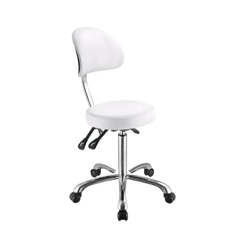 Hocker mit ergonomisch und elegant gestaltetem Rückenlehne und flachem, rundem Sitz. Ausgestattet mit 3 Hebeln zur Einstellung der Höhe, der Neigung der Rückenlehne und der Sitzfläche. Bezogen mit hochwertigem weißem PU und verchromtem Gestell mit 5 sehr stabilen Rollen.