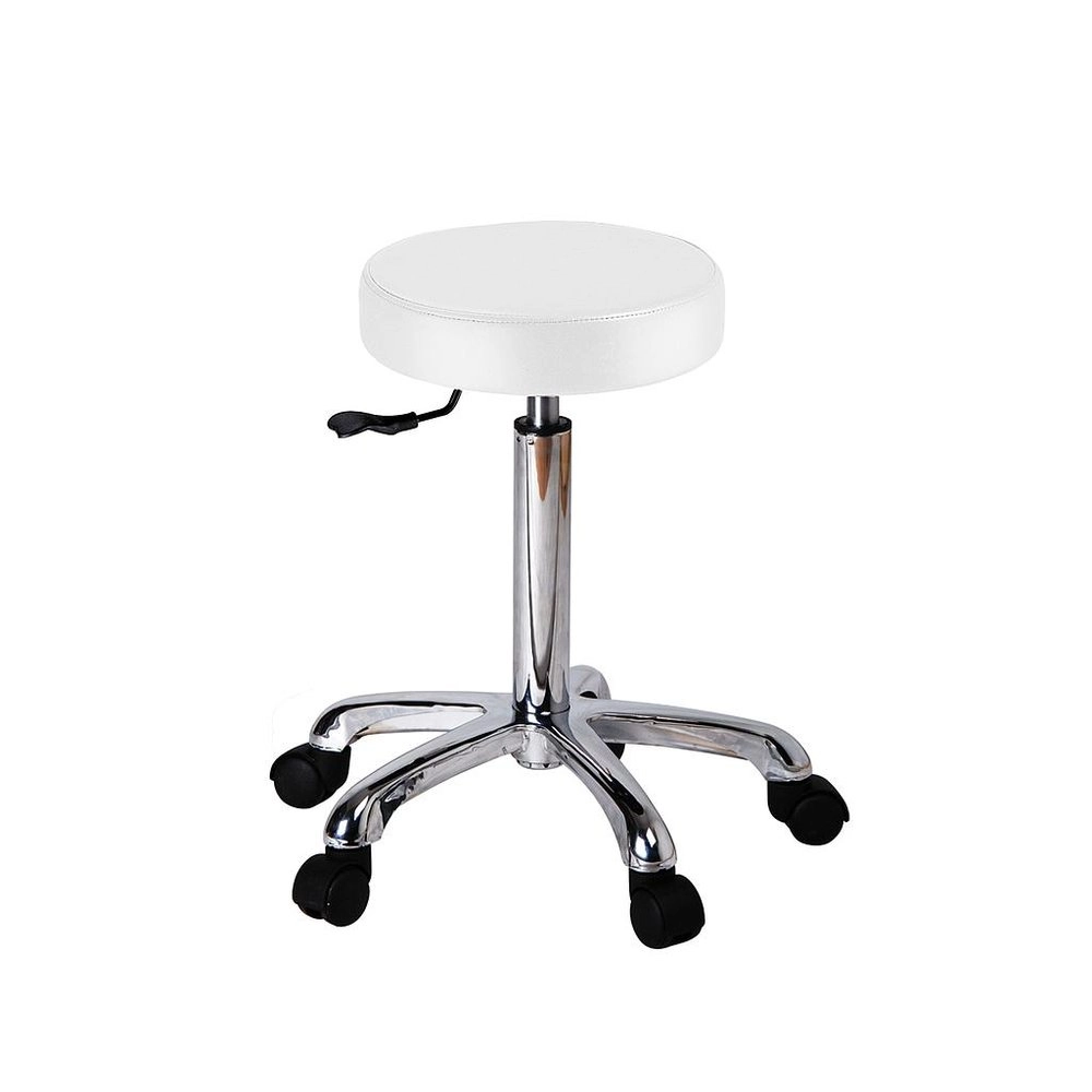 Praktischer Hocker mit ergonomischem Design. Flacher, runder Sitz mit Höhenverstellung durch Gasfeder. Bezogen mit hochwertigem weißem PU und verchromtem Fuß mit 5 Rollen.