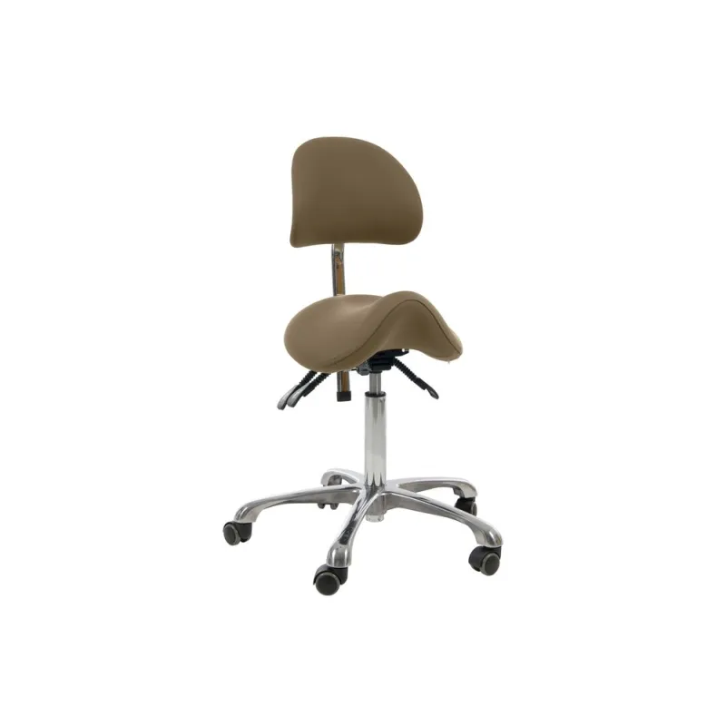Hocker mit umschließender Rückenlehne in ergonomischem und elegantem Design, mit sattelförmigem Sitz, der maximalen Komfort bietet. Ausgestattet mit 3 Hebeln zur Einstellung der Höhe, der Neigung der Rückenlehne und des Sitzes mittels Gasdruckfeder. Bezogen mit hochwertigem weißem PU und verchromtem Gestell mit 5 sehr stabilen Rollen.