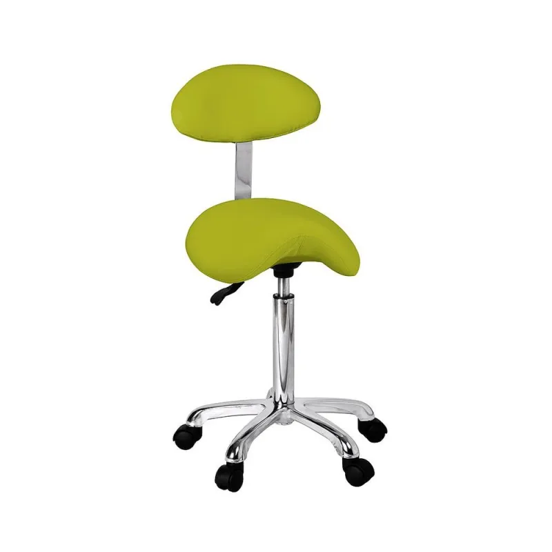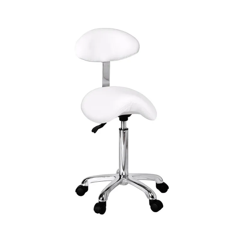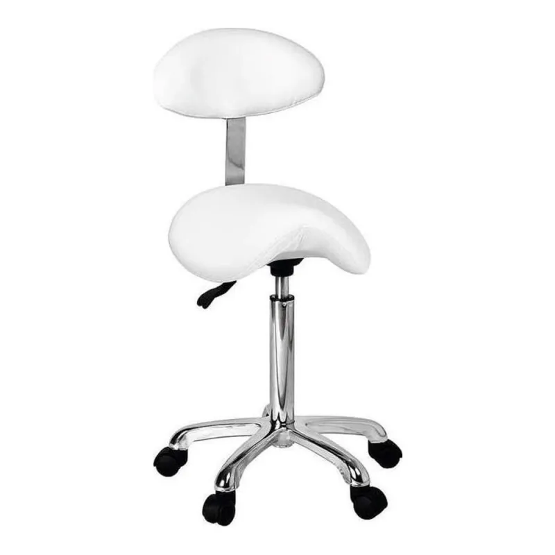 Eleganter und bequemer ergonomisch gestalteter Hocker mit Pony-Sattel-Rückenlehne. Höhenverstellbar mittels Gasdruckfeder. Bezogen mit hochwertigem PU. Verchromtes Gestell mit Rollen.
