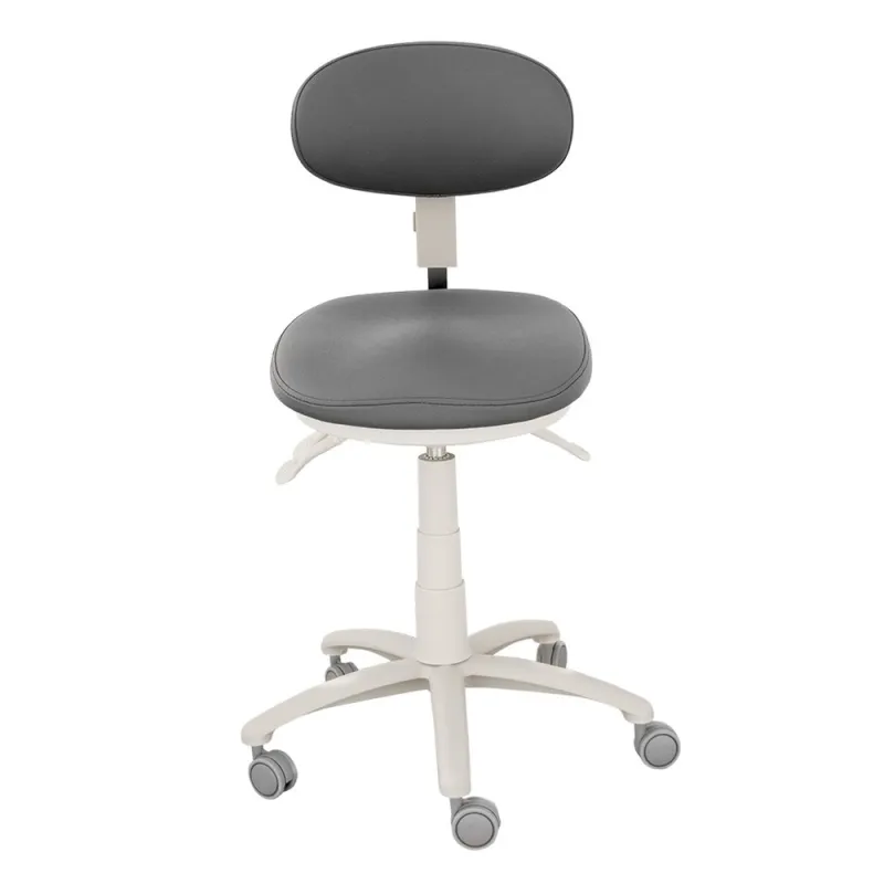 Eleganter Hocker mit umschließendem Rückenteil, ergonomisch gestaltet mit einem Sattelsitz für maximalen Komfort. Ausgestattet mit 3 Hebeln zur Einstellung der Höhe, der Rückenlehne und der Sitzneigung.