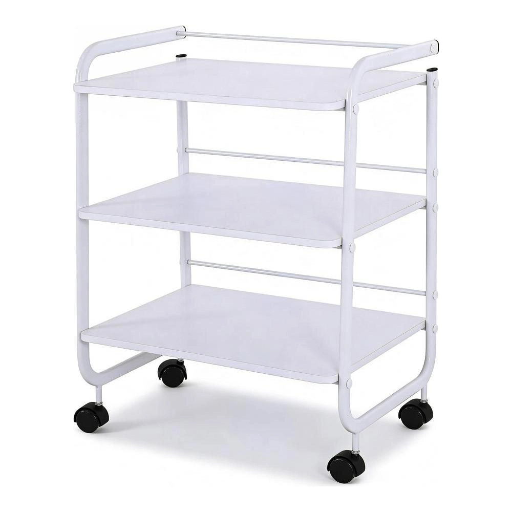 Minimalistischer weißer Metall-Warenkorb. Ausgestattet mit 3 geräumigen Holzablagen. Verfügt über 4 leicht gleitende Rollen für totale und mühelose Mobilität.