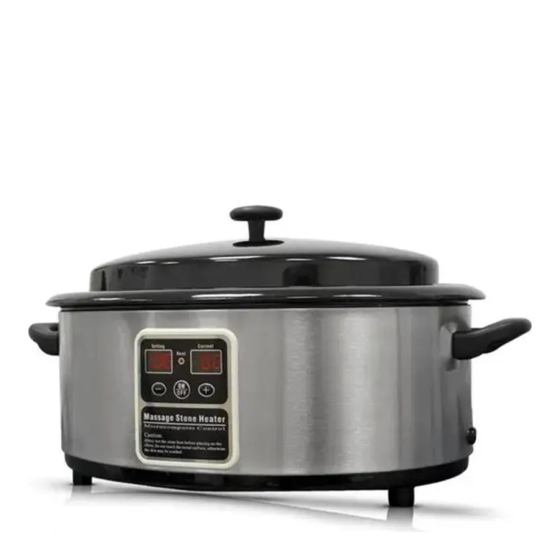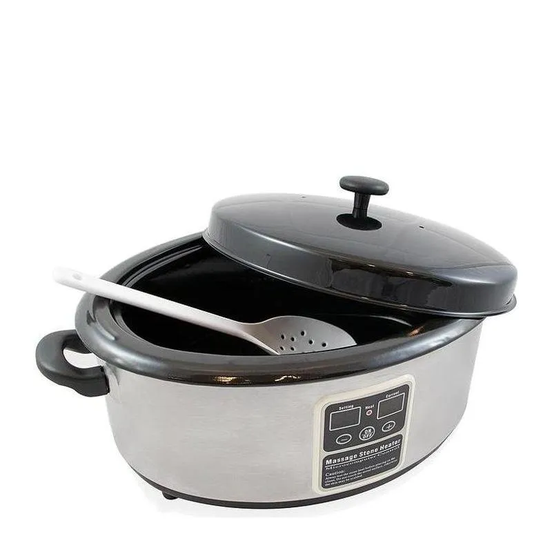 Small stone heater for massage treatments. Equipped with a digital display. Maintains a constant temperature between 40 °C and 50 °C. Includes spoon. Capacity: 6 liters.