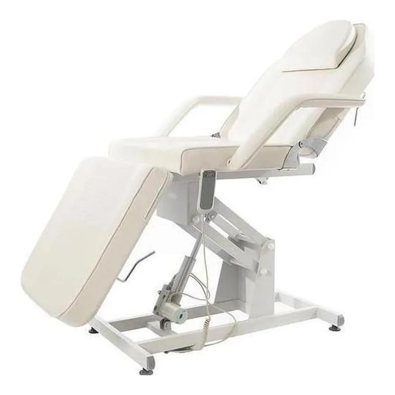 Functional 3-section couch with painted metal frame. Equipped with 1 motor for height adjustment. The backrest and footrest angles are adjusted using a gas piston. Removable armrests and headrest cushion included. White PVC upholstery, easy to clean.