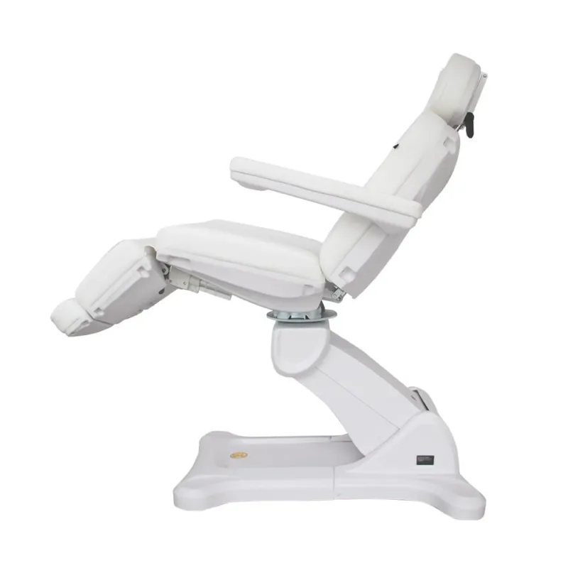 High-end treatment table with a very stable structure, specially designed to optimize workspace thanks to the 240° chair rotation. Equipped with 3 motors that control the height, backrest, and seat inclination. Gas-lift adjustable footrest and foldable armrests. Also available with 4 motors (model 2246B), which allow motorized adjustment of the footrest height. Integrated control panels in the backrest, footrest, and seat allow full control of movements from any point of the table. This version includes the RST function to return to the initial position. High-quality, easy-to-clean PU upholstery.