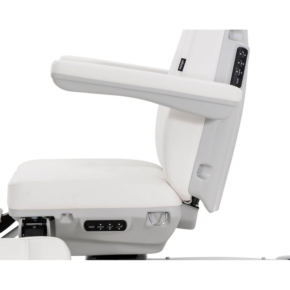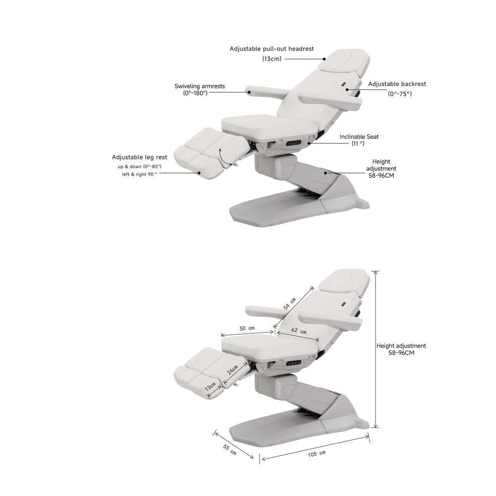 Electric height and backrest adjustment, with Antigravity function. The combination of its movements at the maximum height offers the professional the possibility to work standing, also standing out for its excellent Accessibility to the seat. The footrest is independently adjustable via a gas piston and features a Side opening of the leg supports, ideal for comfortably placing a Hydromassage tub and facilitating the professional's access to the client's feet. 3 Sections mattress with extendable head and foot sections, angle-adjustable headrest with plug for Facial hole. Folding, Removable, and seat-synchronized armrests. Control via Hand controller and integrated buttons, with Position memories. Upholstered in PU, with high-density foam.