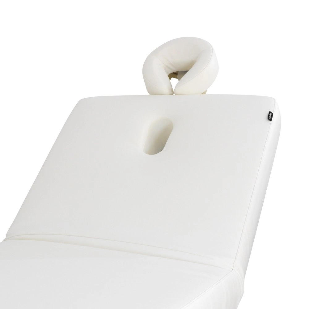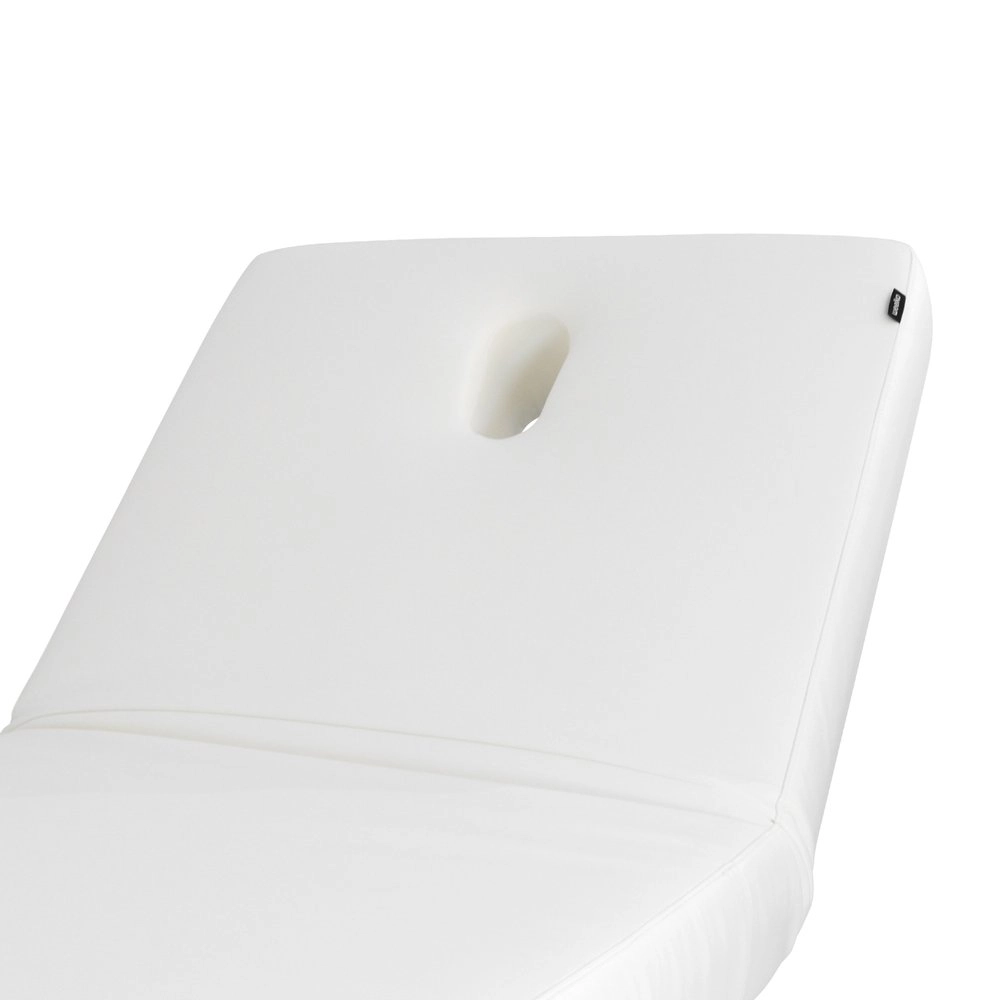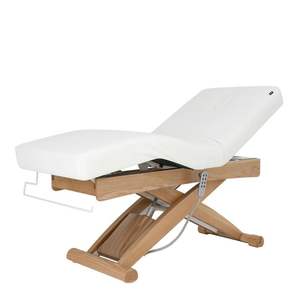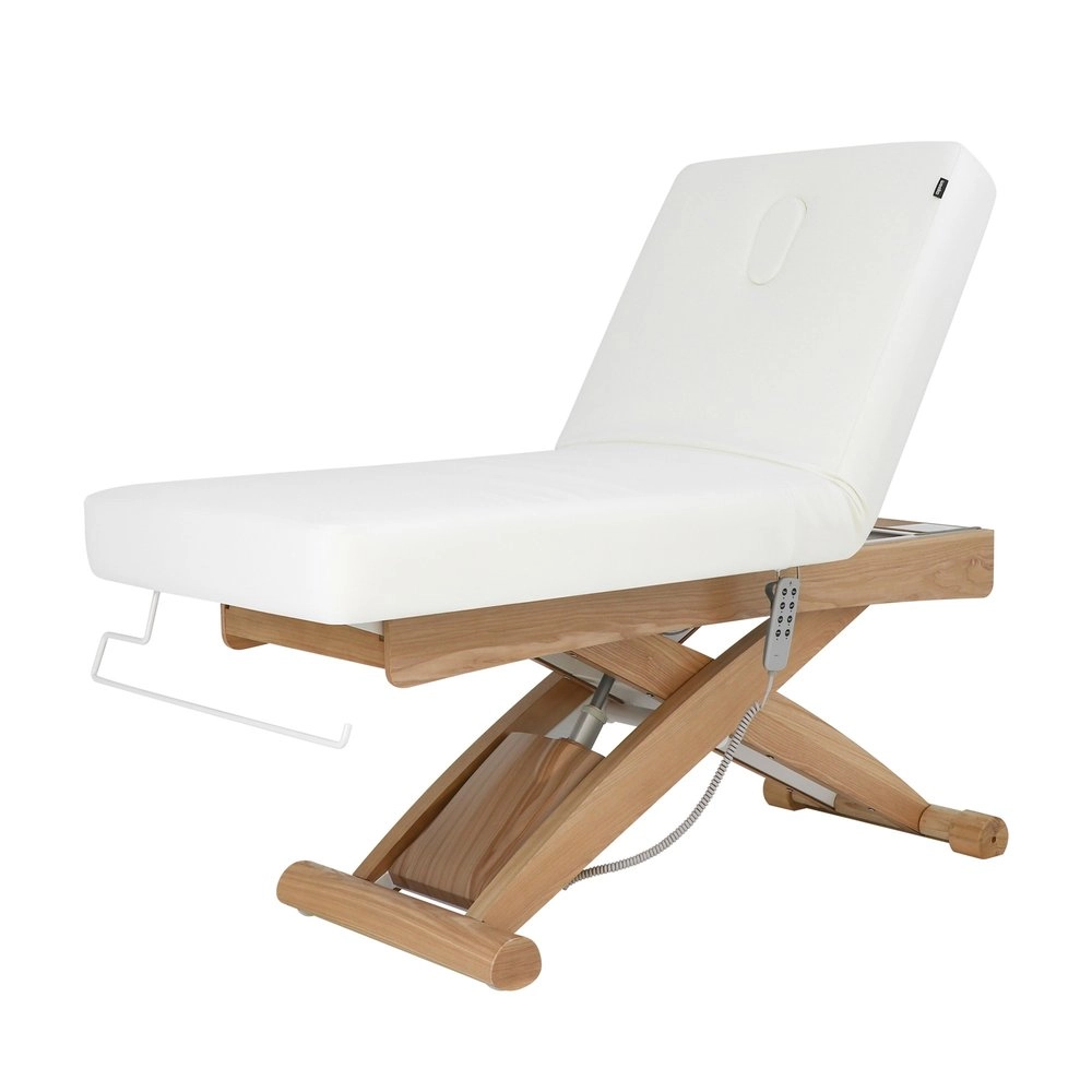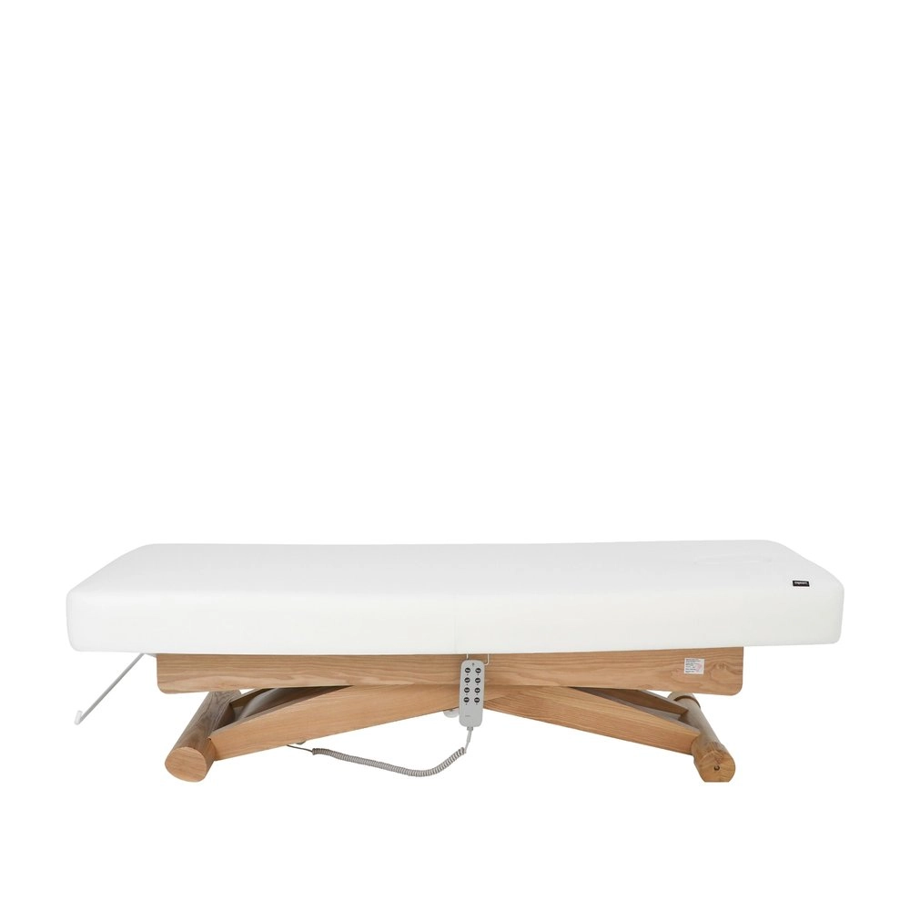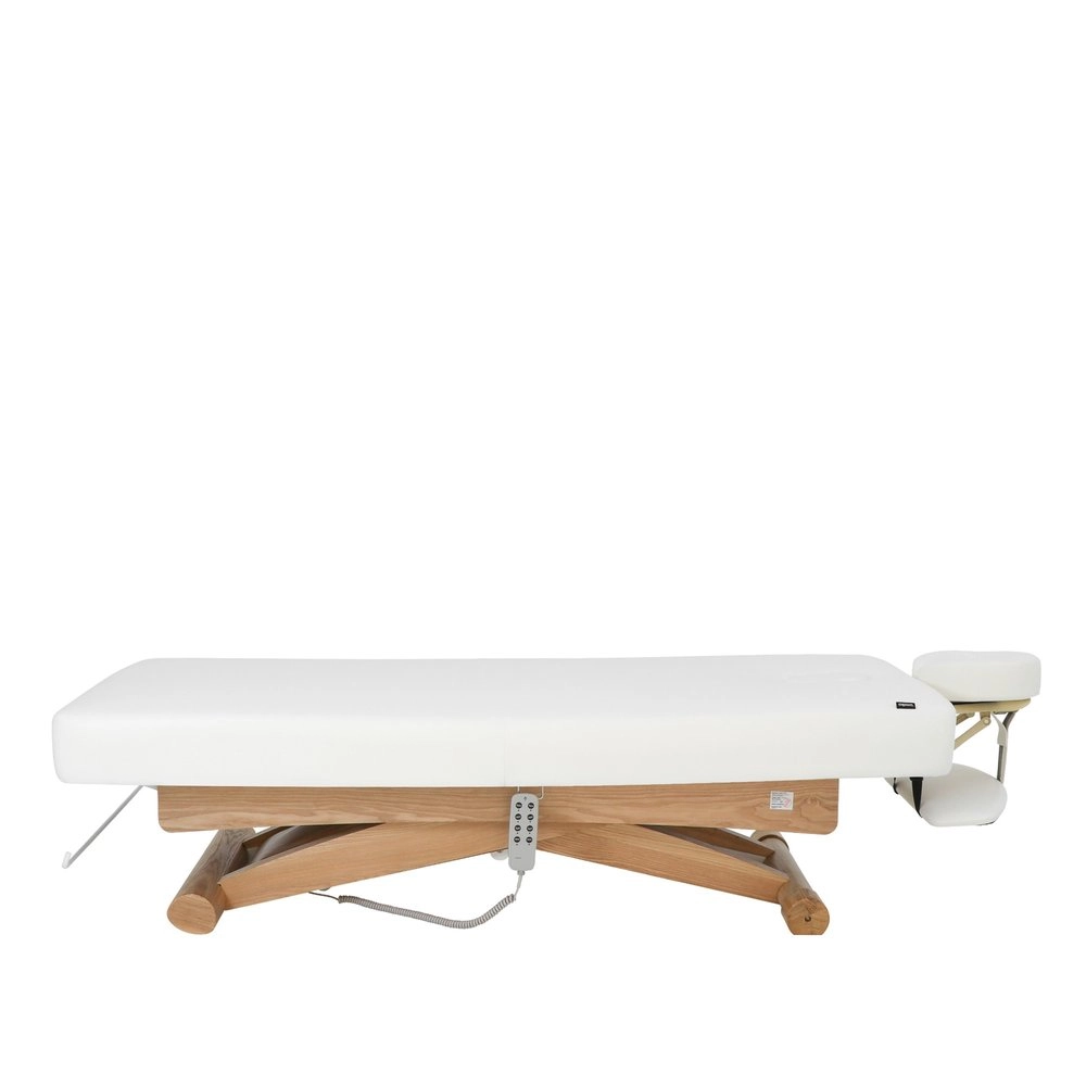 Electric adjustment of height, backrest, and footrest. Its 3 independent motors ensure precision, speed, and ergonomic use, allowing effortless control of the bed's positions to accommodate the patient exactly according to the type of treatment. One-piece 3-section mattress, made with SuperSoft padding and a width designed to provide greater comfort and safety during relaxing treatments. It features a plug for the facial hole and allows for the attachment of an optional headrest accessory to increase the total length, which includes additional armrests. Control via Hand control. Upholstered in high-quality PU, with a structure featuring finishes in natural wood that elevate the perception of luxury in the cabin and includes integrated wheels for easy mobility.