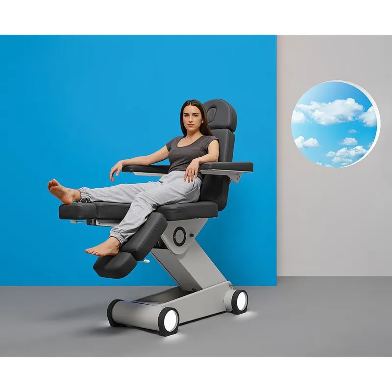 High-end podiatry chair that stands out for its innovative design. Equipped with 3 motors that control the height and the inclination of the backrest and seat. Reclining and removable armrests and headrest. Leg rests adjustable in height via gas piston. Highly stable steel frame with integrated white LED light in the base. High-quality white PU upholstery.