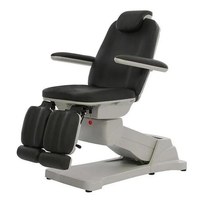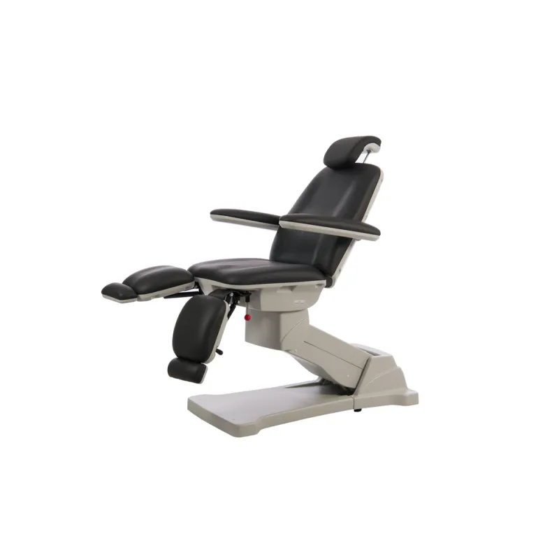 High-end podiatry chair equipped with 3 motors that control the height, backrest recline, and seat tilt. Folding armrests and adjustable headrest cushion with multiple preset positions. Footrests are independently height-adjustable via a gas spring and feature side opening in two preset positions up to 90°. Grey high-quality PU upholstery, easy to clean.