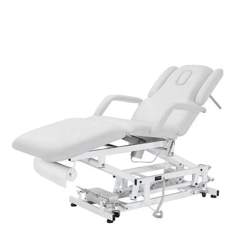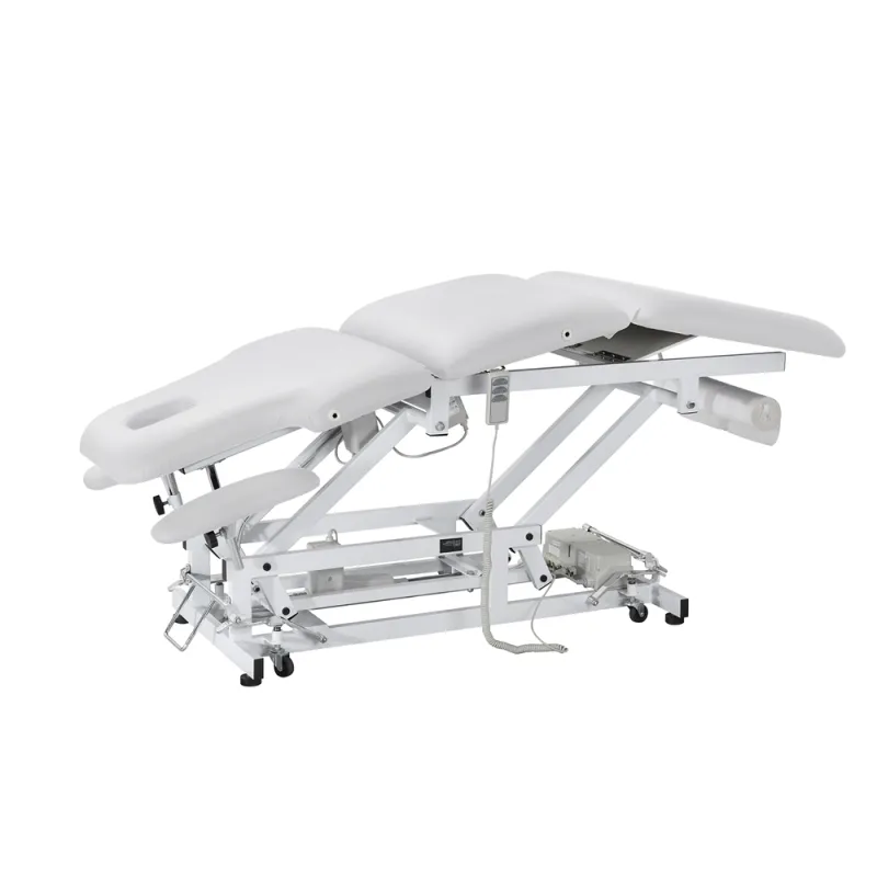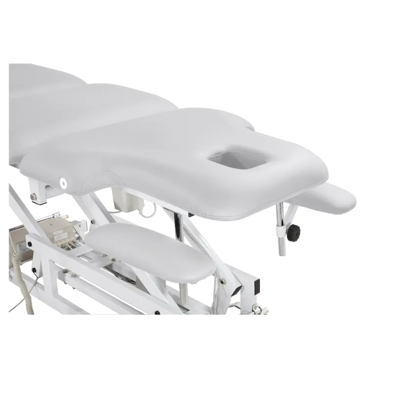 High-performance treatment table specially designed for physiotherapy. It features 3 motors that adjust the height, backrest inclination, and central module. Double armrest system: the fixed ones are adjustable, and the side ones are removable. Backrest with face hole and additional positioning cushion. Metal structure with retractable wheels for easy movement. White high-quality PU upholstery, easy to clean. Built-in roll holder.