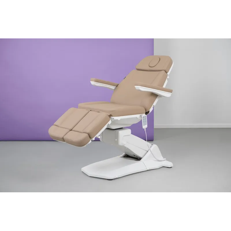 Electric podiatry table with a very stable structure, designed to offer maximum functionality for medical and aesthetic treatments. Equipped with 3 motors that adjust height, backrest, and seat tilt. Includes independent, extendable, and reclining footrests, as well as rotating armrests. Upholstered in high-quality white and beige PU, durable and easy to clean. Ideal for clinics, podiatry centers, and professional practices. Heating option available.