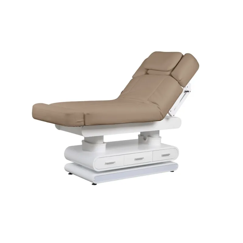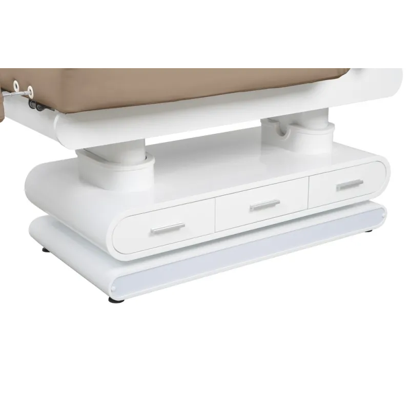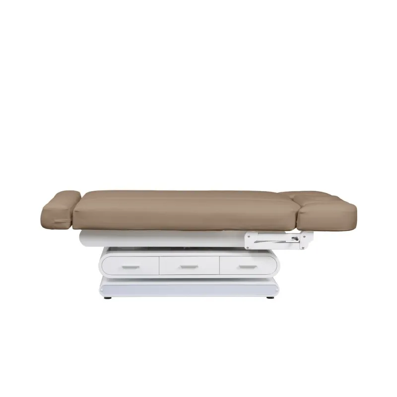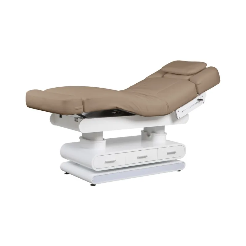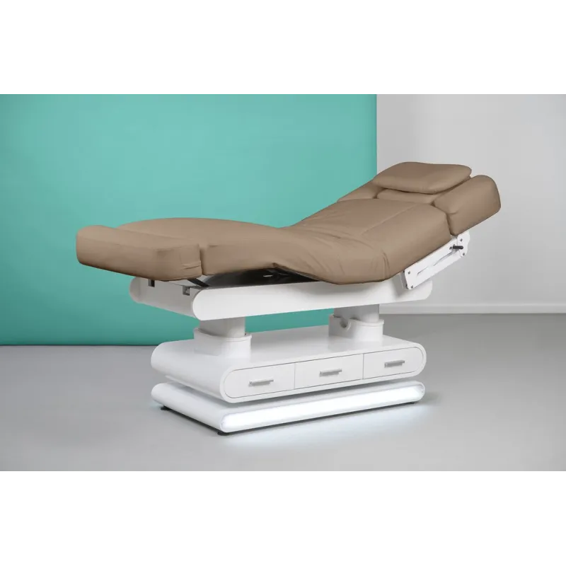 High-end spa bed with integrated heating system and robust structure, designed for wellness, beauty, and relaxation treatments. Equipped with 4 motors that adjust the height, backrest, seat, and footrest. Features an ergonomic mattress with thick padding, folding armrests, face hole with cushion, and ambient LED lighting system. Upholstered in high-quality white and beige PU, durable and easy to clean.