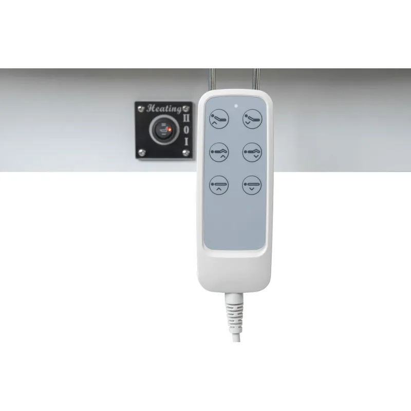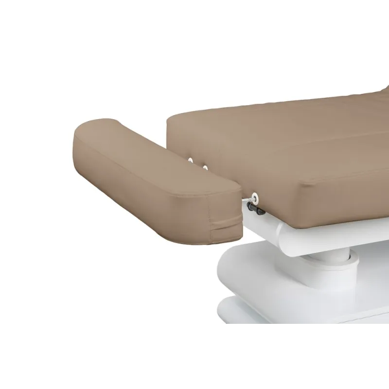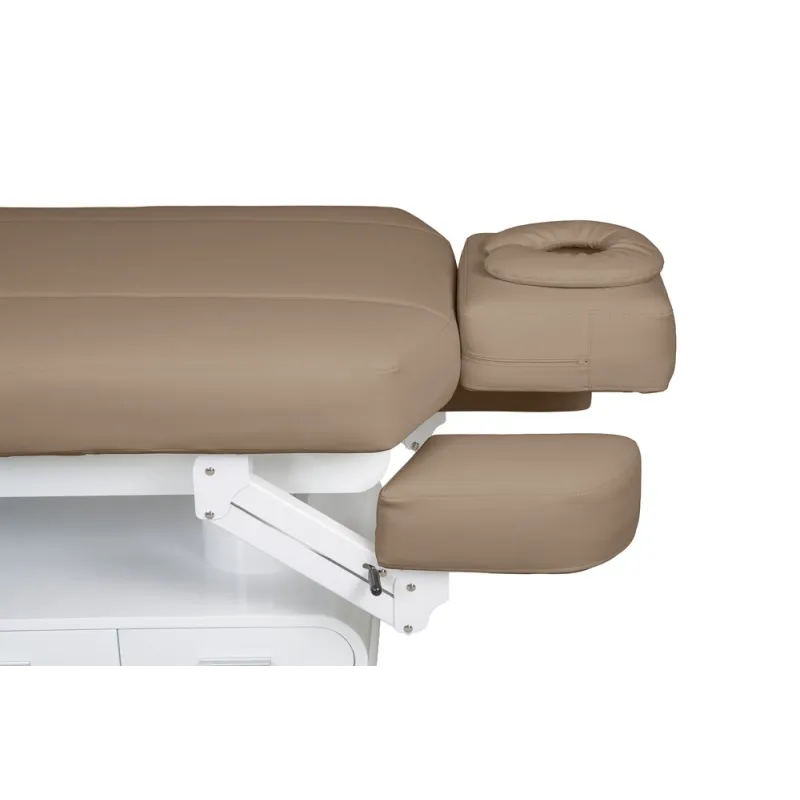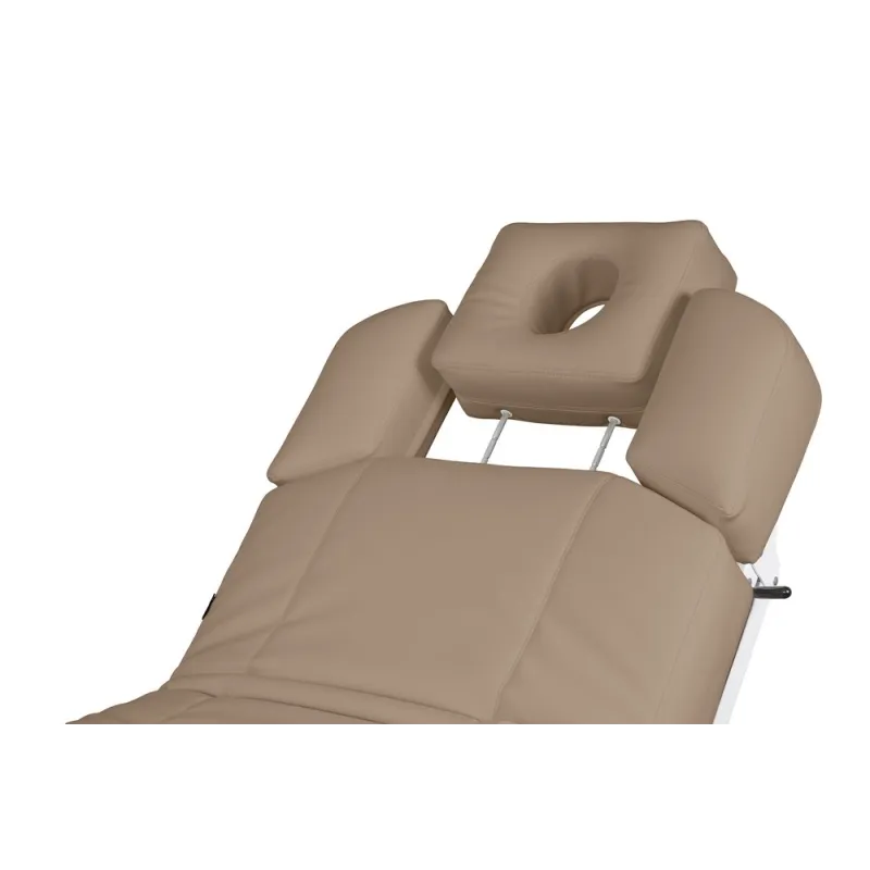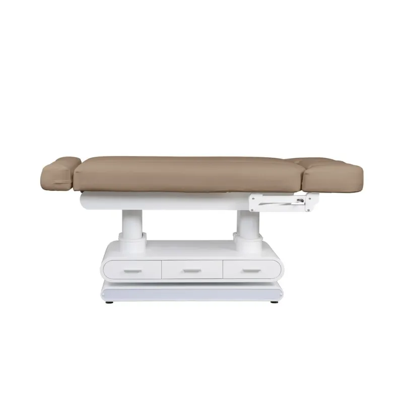 High-end spa bed with integrated heating system and robust structure, designed for wellness, beauty, and relaxation treatments. Equipped with 4 motors that adjust the height, backrest, seat, and footrest. Features an ergonomic mattress with thick padding, folding armrests, face hole with cushion, and ambient LED lighting system. Upholstered in high-quality white and beige PU, durable and easy to clean.