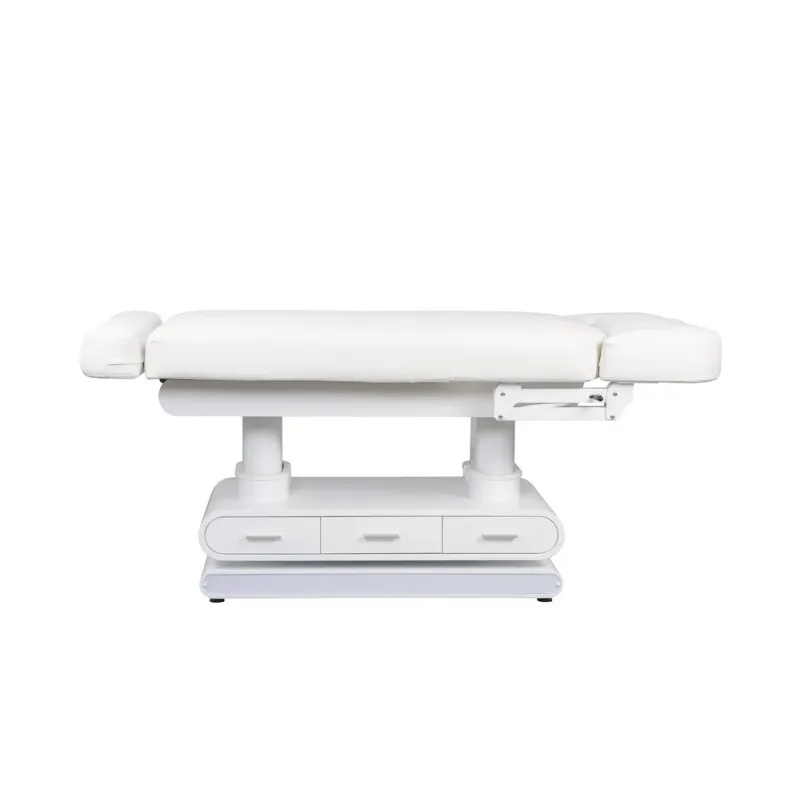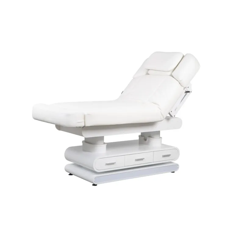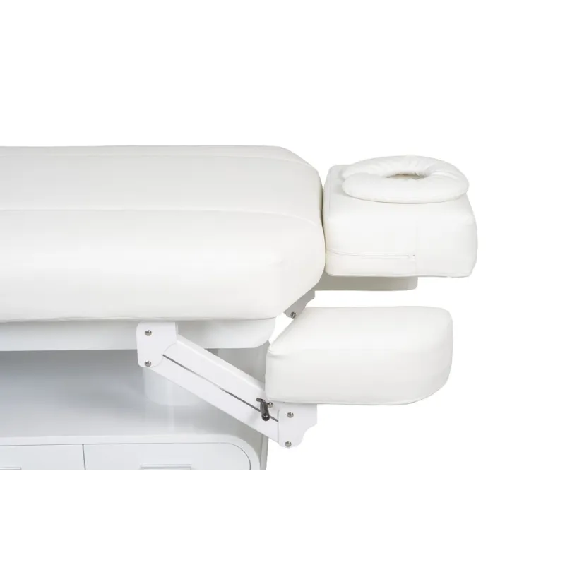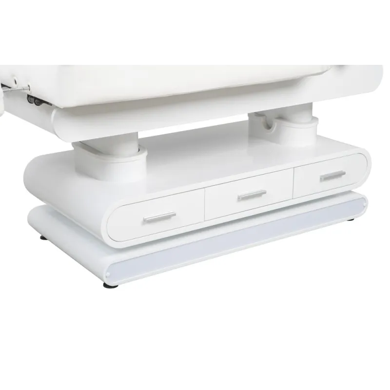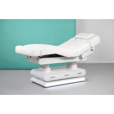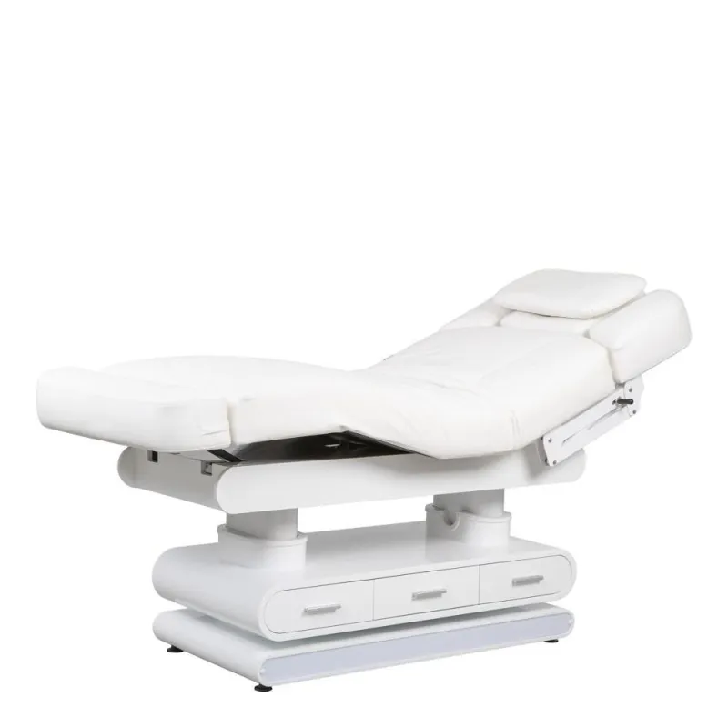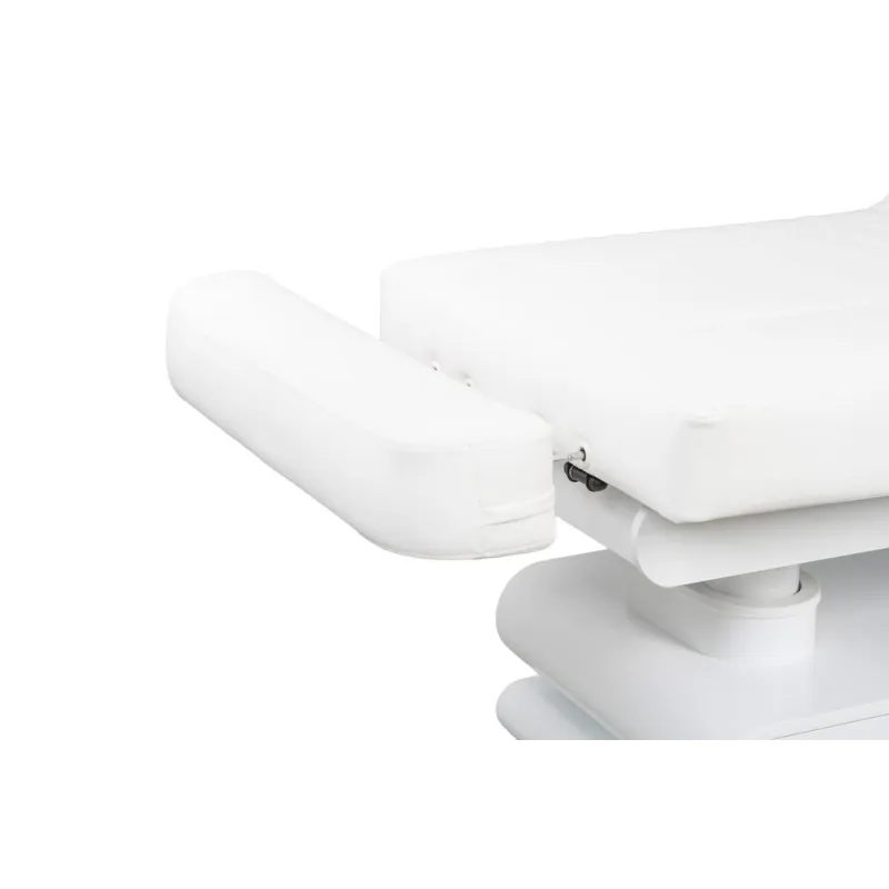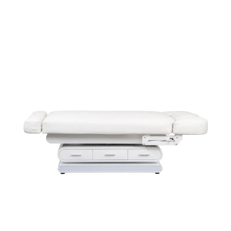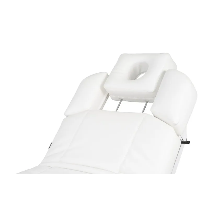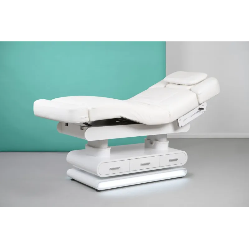 High-end spa bed with integrated heating system and robust structure, designed for wellness, beauty, and relaxation treatments. Equipped with 4 motors that adjust the height, backrest, seat, and footrest. Features an ergonomic mattress with thick padding, folding armrests, face hole with cushion, and ambient LED lighting system. Upholstered in high-quality white and beige PU, durable and easy to clean.