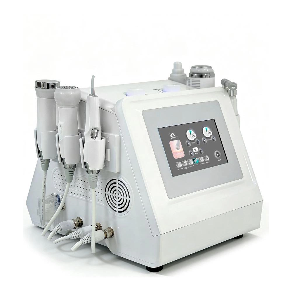 Modern 6 in 1 digital touch equipment with advanced technologies for Professional use in facial care, equipped with ultrasonic peeling, hydrodermabrasion, ultrasound, BIO, oxygen spray, and cold hammer. It features a digital touch screen with a very intuitive interface. Designed for non-invasive treatments of deep skin cleansing, hydration, nourishment, and oxygenation.