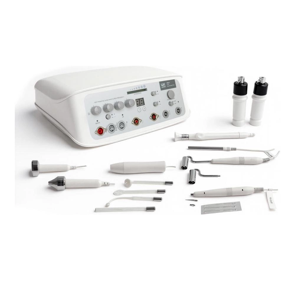 Beauty equipment that combines 6 functions: high frequency, ultrasound, galvanic current, suction and spraying, and spot corrector. It features dedicated on/off controls, adjustable intensity, and a Digital Screen, allowing for versatile and fully customizable sessions, ideal for comprehensive skin care in salons or clinics.