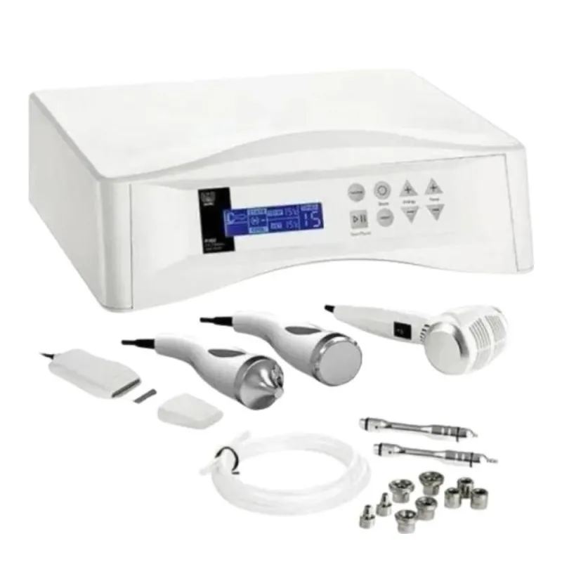 Beauty equipment that combines 4 functions: diamond-tip microdermabrasion, ultrasound, hot and cold hammer, and ultrasonic exfoliating spatula. Ideal for deep cleansing and for improving cell metabolism, soothing, and enhancing the skin's absorption capacity.