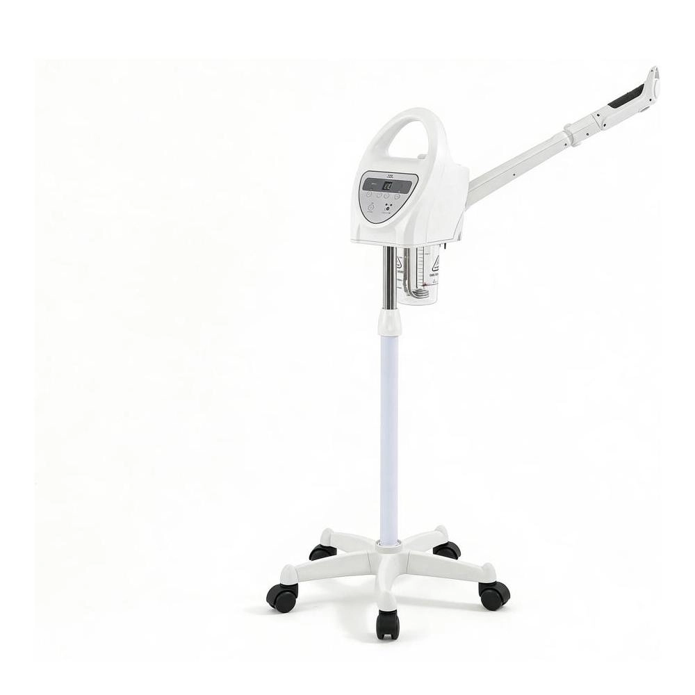 High-end facial steamer with digital screen and ozone function that provides hot ionic steam to deeply hydrate and open pores, as well as ozone sterilization. It features steam volume adjustment and heat maintenance functions. Also equipped with a digital timer and a head with an aroma container and herbal function, 360º adjustable for more precision. Movable arm to the right and left 130º and 60º forward and backward. Intelligent safety design: The integrated automatic water level detection prevents dry operation, increasing the device's durability. Adjustable height (108cm to 137cm) and stable base with 5 wheels for easy movement.