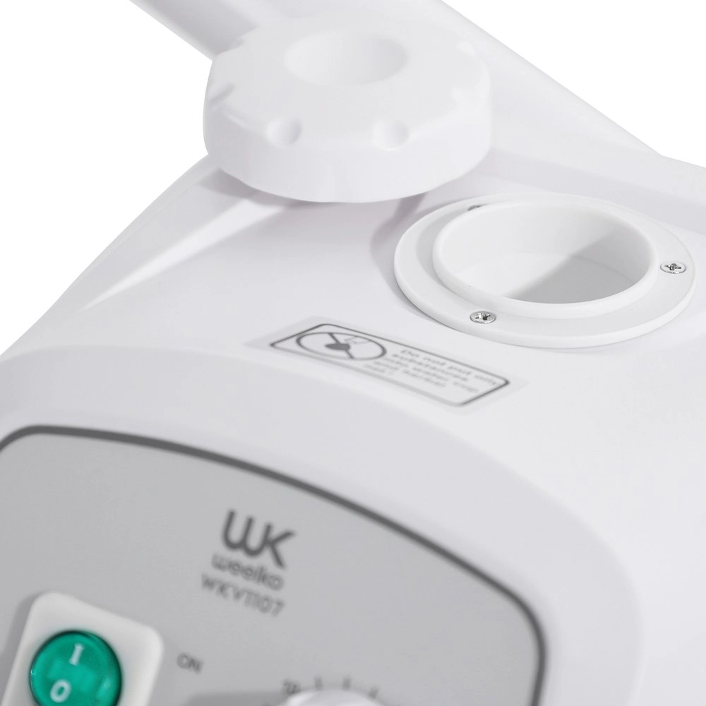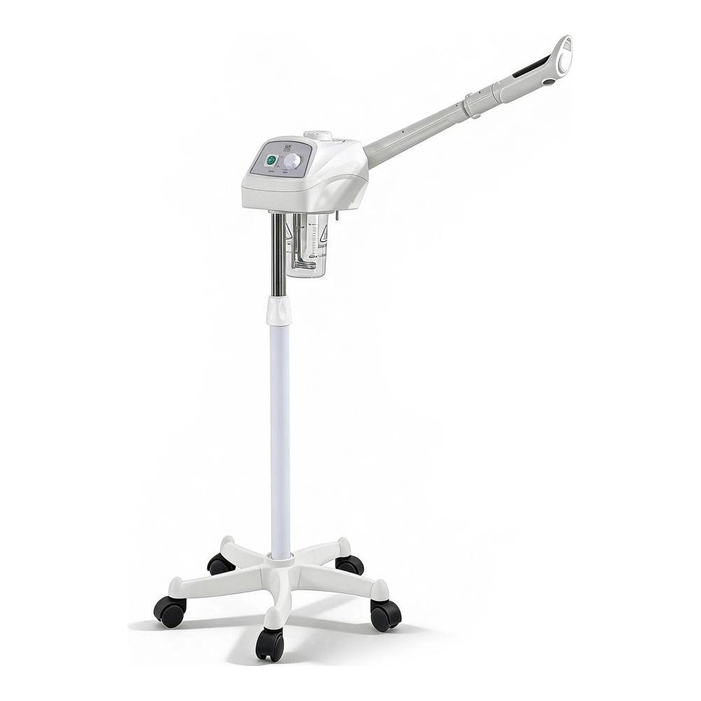 Facial steamer with ozone function that provides hot ionic steam to deeply hydrate and open pores, as well as sterilization with ozone. It features steam volume adjustment and heat maintenance functions. Also equipped with a manual timer and a head with an aroma container and herbal function, 360º adjustable for more precision. Movable arm to the right and left 130º and 60º forward and backward. Intelligent safety design: The integrated automatic water level detection prevents dry operation, increasing the device's durability. Adjustable height (108cm to 137cm) and stable base with 5 wheels for easy mobility.
