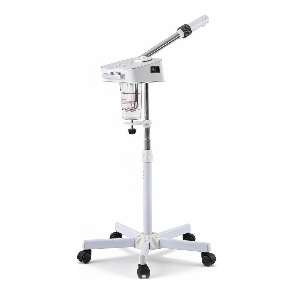 High-end facial steamer with digital screen and ozone function that provides hot ionic steam to deeply hydrate and open pores, as well as sterilization with ozone. It features adjustable steam volume and heat maintenance functions. Also equipped with a digital timer and a head with an aroma container and herbal function, 360º adjustable for more precision. Movable arm to the right and left 130º. Intelligent safety design: The integrated automatic water level detection prevents dry operation, increasing the device's durability. Adjustable height (108cm to 137cm) and stable base with 5 wheels for easy movement.