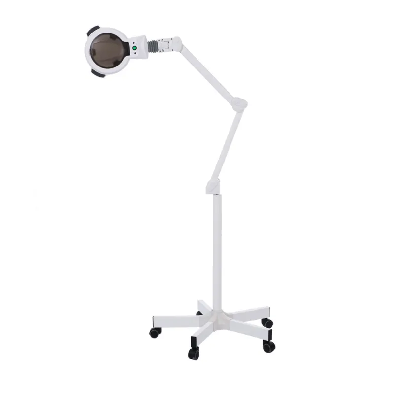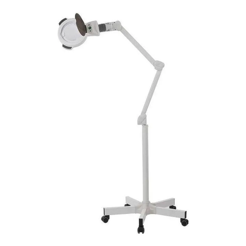 Cold light LED lamp with 5x magnifying lens, ideal for precision work in professional settings. The light intensity is adjustable, allowing it to adapt to the needs of each treatment. Equipped with an articulated arm for easy positioning and a 5-wheel base that ensures maximum stability and mobility in the cabin. Stands out for its ergonomic design with two handles that allow for comfortable and precise positioning.