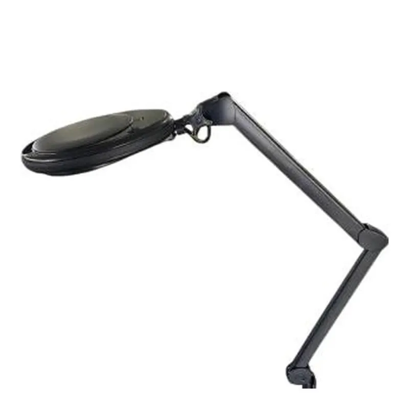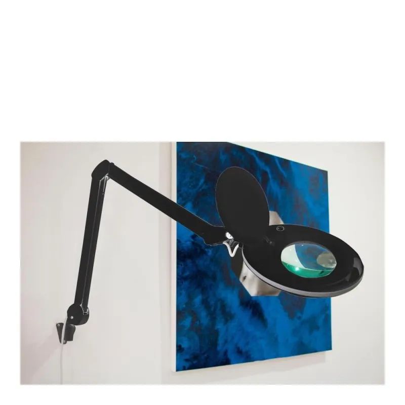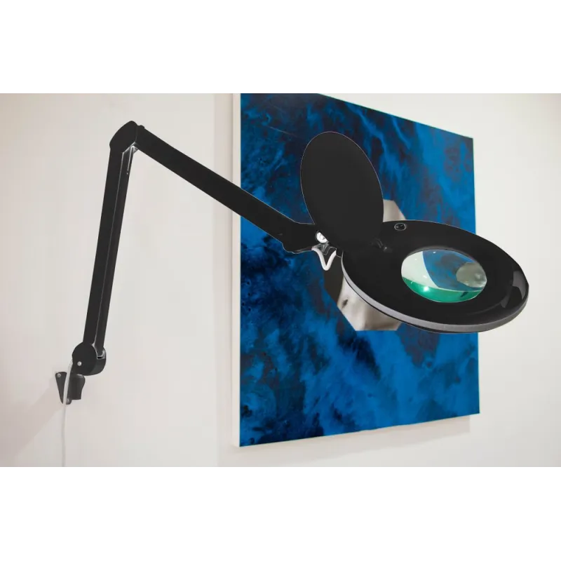 Cold light LED lamp with 5x magnifying lens. Equipped with an articulated arm and clamp for attachment to tables or beauty trolleys. Also available with wall-mount option.