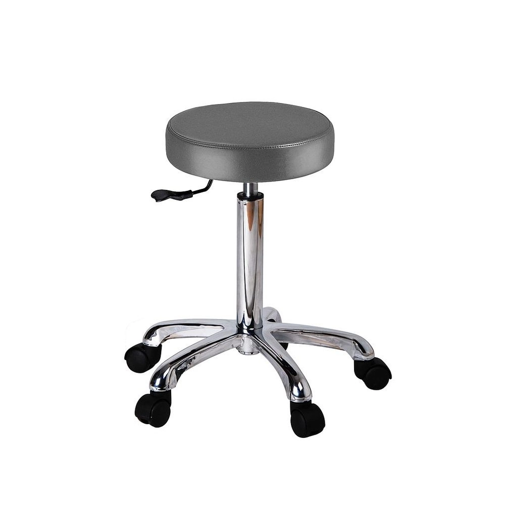 Practical stool with ergonomic design. Flat, round seat with height adjustable via gas lift. Upholstered in high-quality white PU and chrome base with 5 wheels.
