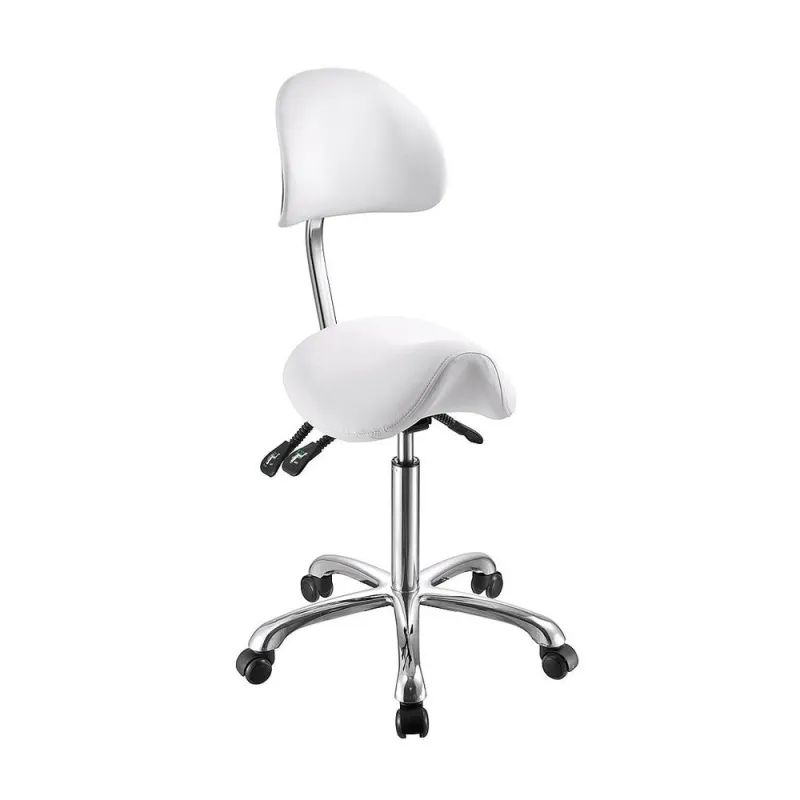 Stool with wraparound backrest in an ergonomic and elegant design, with a saddle-shaped seat that ensures maximum comfort. Equipped with 3 levers that allow height, backrest tilt, and seat tilt adjustment via gas piston. Upholstered in high-quality white PU and chrome base with 5 very stable wheels.