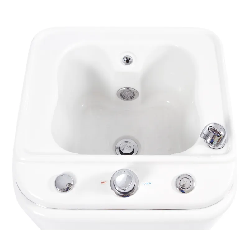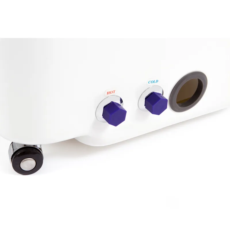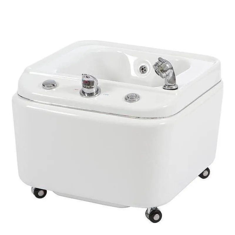 Bañera para masaje de pies con total movilidadgracias a sus 4 ruedas. Posibilidad de escoger entre agua fría y caliente. Equipada con una práctica ducha con chorro de agua ajustable. Hidromasaje e iluminación LED.