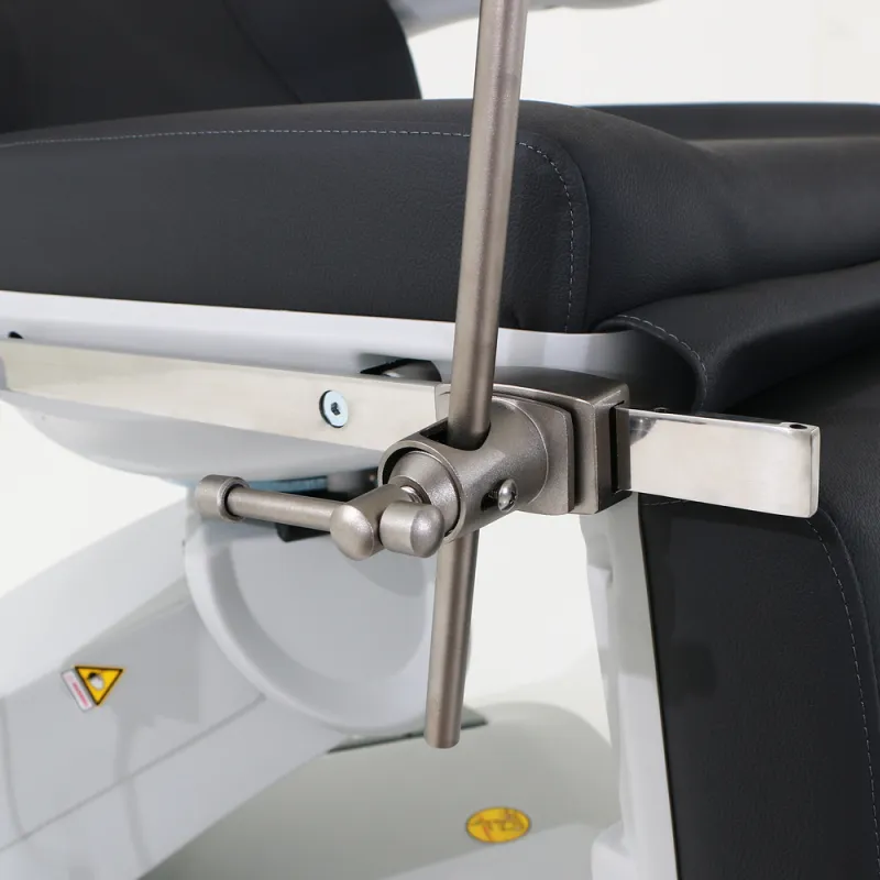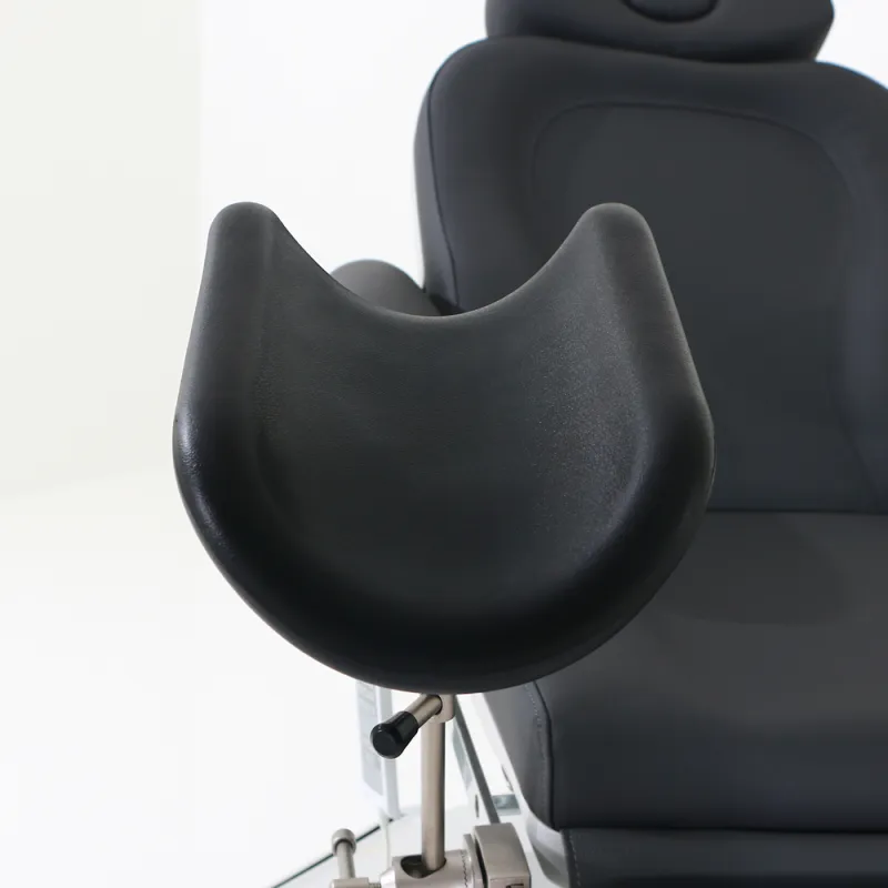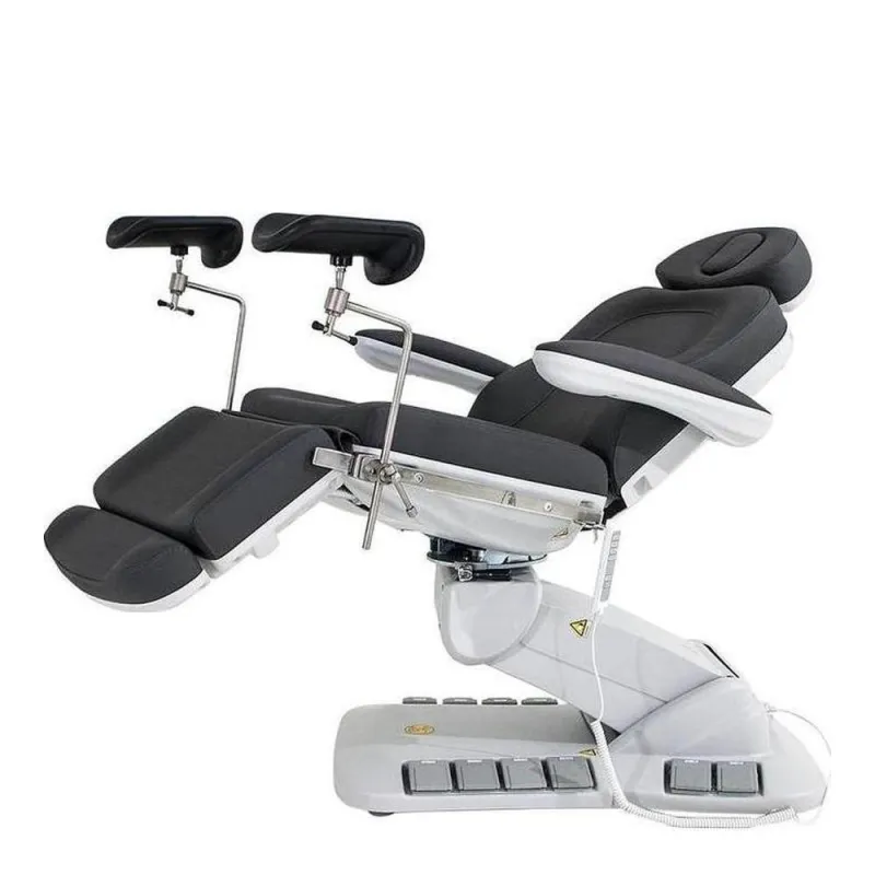 Sillón de reconocimiento ginecológico de alta gama con estructura muy estable, diseñada especialmente para optimizar el espacio de trabajo gracias a la rotación del sillón de 120°. Dispone de 4 motores que controlan la altura, la inclinación del respaldo, del asiento y del reposapiés. Equipado de serie con reposabrazos abatibles y soportes reposapiernas ajustables. Los pedales integrados permiten un total control de los movimientos desde cualquier punto de la camilla. Esta versión incluye bloqueo por seguridad y la función RESET de retorno a la posición inicial. Tapizado PU gris de alta calidad y fácil de limpiar. Portarrollos y protección de plástico para reposapiernas incluidos. Este producto está diseñado según reglamento de productos sanitarios 2017/745.