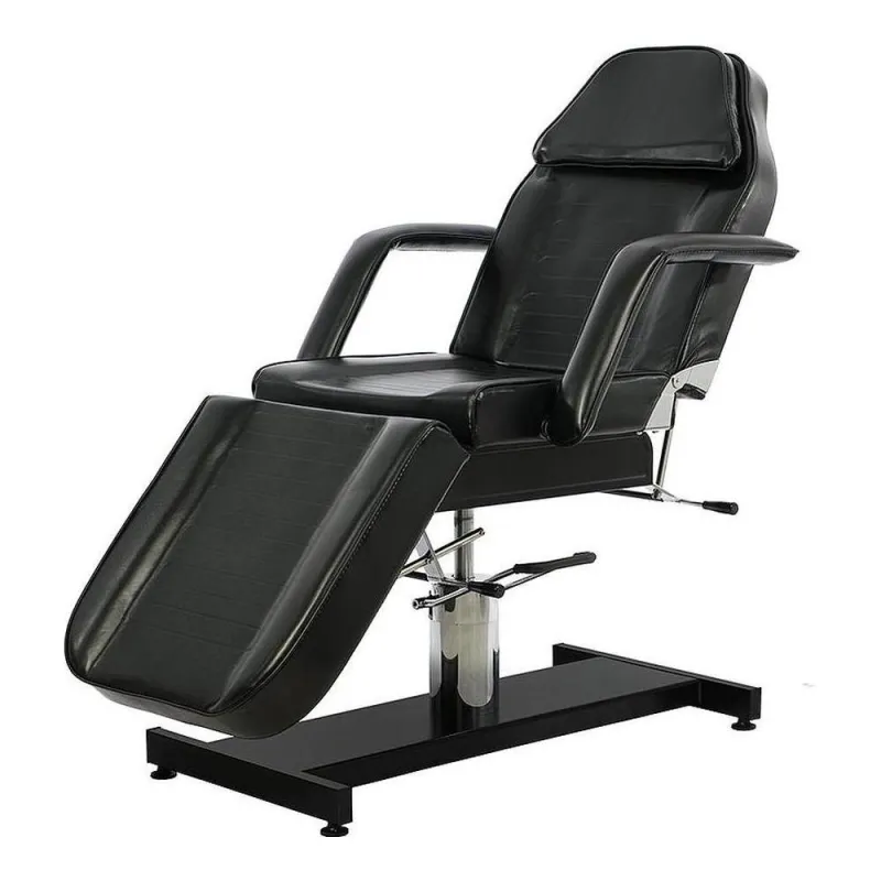 Camilla funcional de 3 cuerpos con estructura metálica pintada. Regulable en altura mediante bomba hidráulica. La inclinación del respaldo y del reposapiés se regulan manualmente. Reposabrazos extraíbles. Tapizado negro en PVC y fácil de limpiar. Portarrollos incorporado.