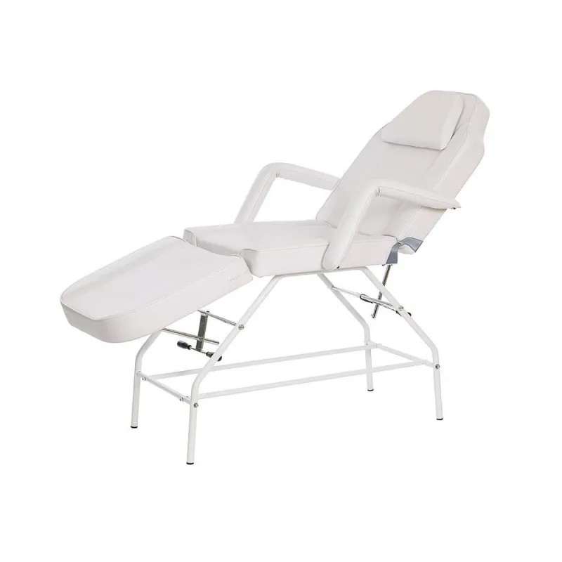 Camilla fija de 3 cuerpos y estructura metálica negra. La inclinación del respaldo y del reposapiés se regulan manualmente. Reposabrazos y cojín reposacabezas extraíbles con agujero facial. Tapizado negro en PVC fácil de limpiar.