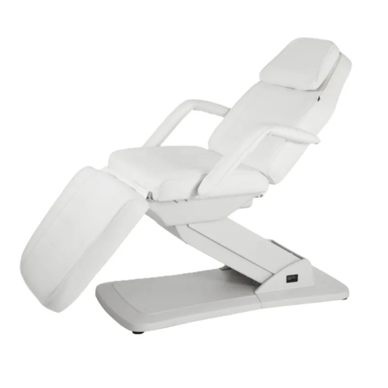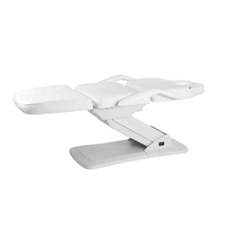Camilla funcional de 3 cuerpos con estructura muy estable. Equipada con 3 motores que controlan la altura, la inclinación del respaldo y del reposapiés. Reposabrazos y cojín reposacabezas extraíbles. Con agujero facial. Tapizado blanco en PU de alta calidad y fácil de limpiar.