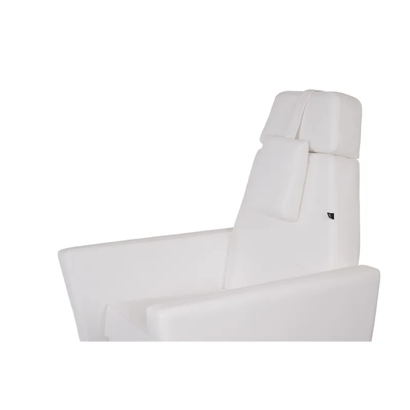 Sillón de pedicura spa de cómodo y elegante diseño con tapizado en PU blanco de alta calidad. Equipado con 2 motores que regulan la inclinación del respaldo y el desplazamiento del asiento mediante botonera integrada en el apoyabrazos. Sus reposabrazos giratorios facilitan el acceso al sillón. Bañera de pies con hidromasaje, ducha y luz LED. Reposapiés regulable manualmente en altura.