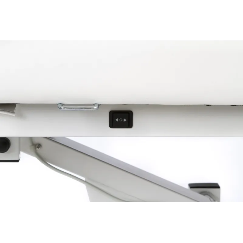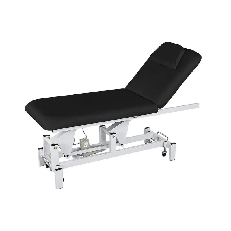 Camilla de 2 cuerpos con estructura metálica muy estable. Equipada con 1 motor que permite regular la altura mediante la botonera integrada en la estructura. La inclinación del respaldo se regula con pistón de gas. Cojín reposacabezas extraíble con agujero facial. Ruedas escamoteables que facilitan su desplazamiento. Tapizado en PU de gran calidad y fácil de limpiar. Portarrollos incorporado.