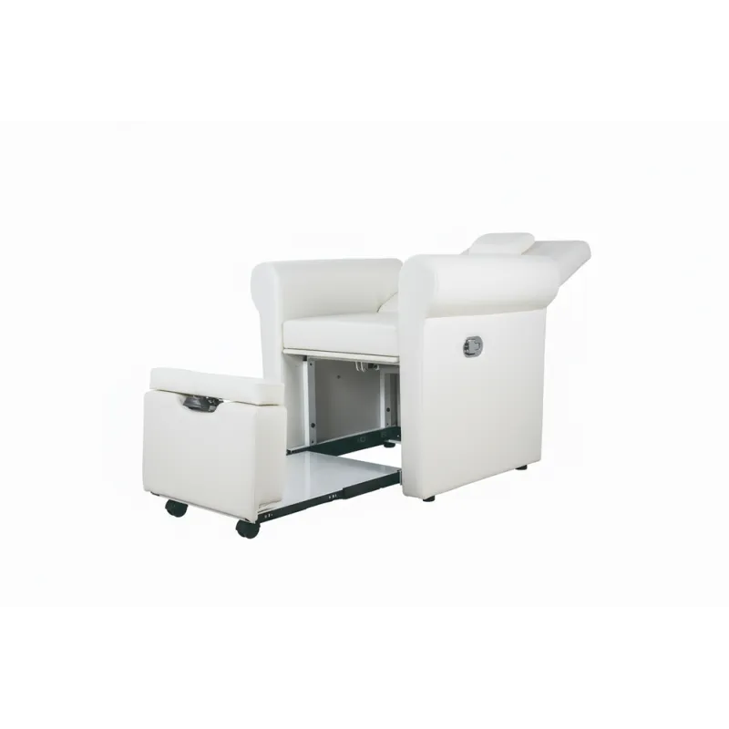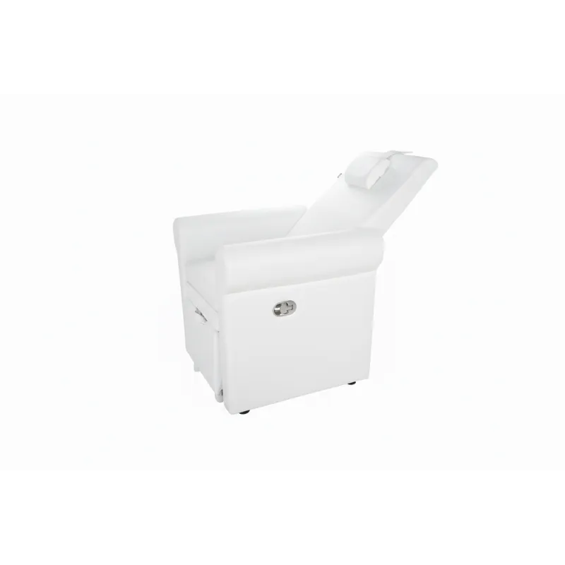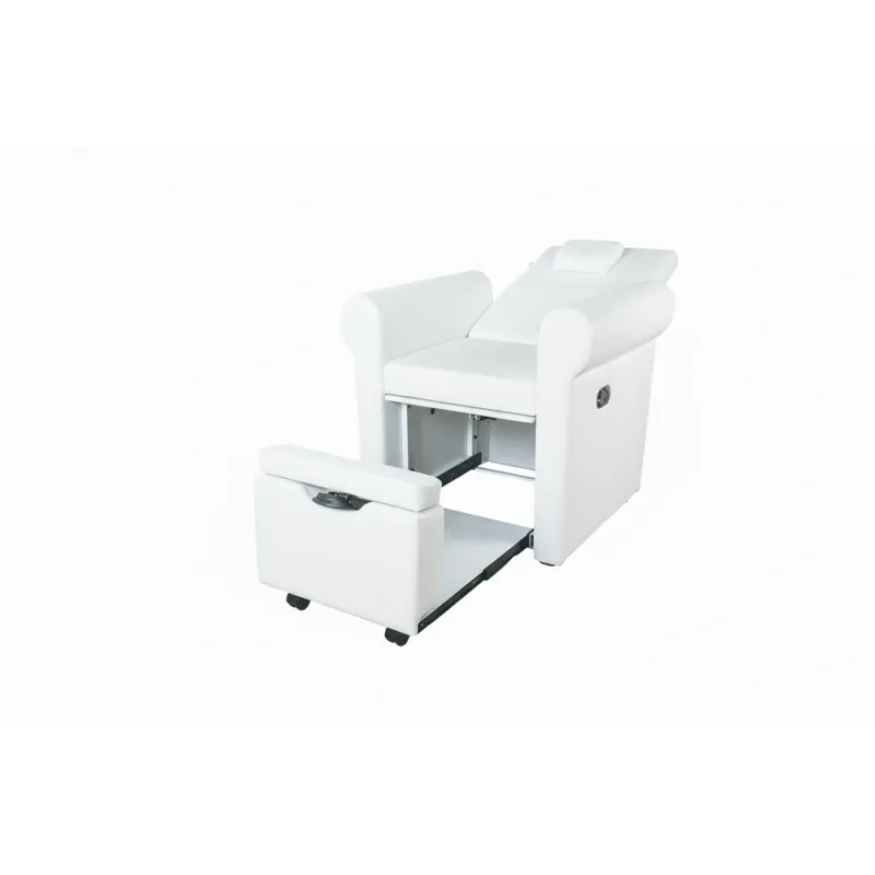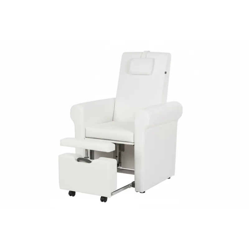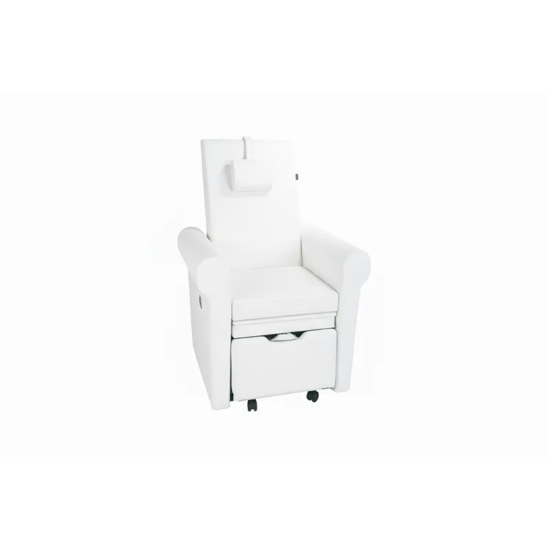 Sillón de pedicura spa de cómodo y elegante diseño con tapizado en PU blanco de alta calidad. La inclinación del respaldo se regula mediante pistón de gas. Dispone de compartimento extraible bajo el asiento que permite colocar un bol para pedicuras. Reposapies regulable.