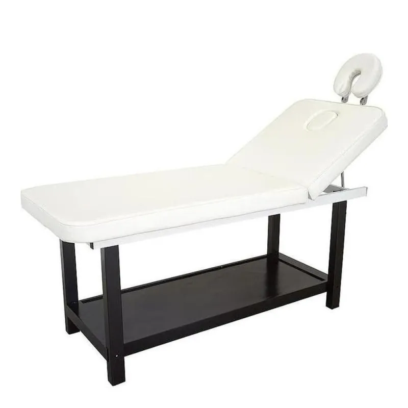 Camilla fija de 2 cuerpos de madera en color wenge. Plataforma inferior para almacenaje. Respaldo regulable manualmente con agujero facial y reposacabezas regulable. Tapizado blanco en PVC fácil de limpiar.