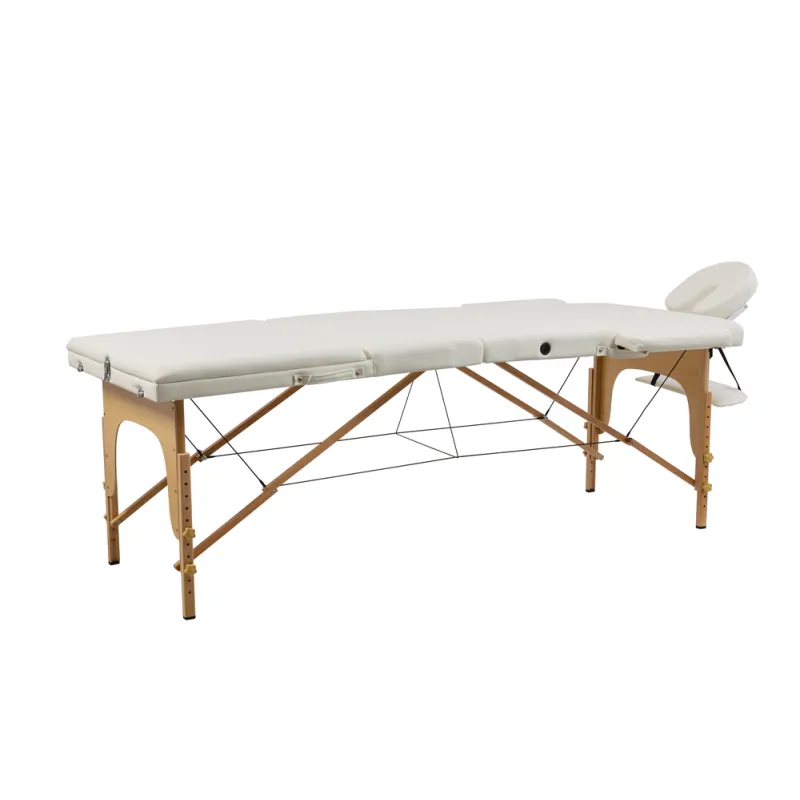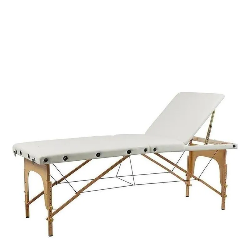 Camilla portátil de 3 cuerpos con estructura de madera ligera y ajustable mediante tensores. Altura regulable mediante posiciones fijas y plegado desde cualquiera de ellas. Respaldo regulable en posiciones fijas con agujero facial. Reposabrazos laterales, cabezal para masaje cervical y soporte reposabrazos incluidos. Bolsa de transporte. Tapizado en PVC blanco y acolchado de alta densidad.