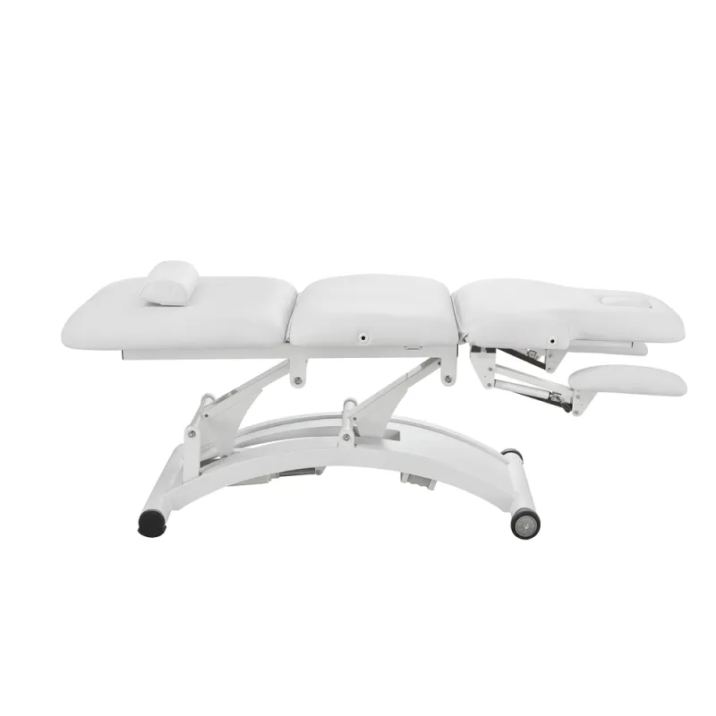 Camilla de altas prestaciones especialmente indicada para fisioterapia. Consta de 3 motores que regulan la altura, la inclinación del respaldo y del módulo central. Sistema doble de reposabrazos: los fijos son regulables mediante pistón de gas y los laterales extraíbles. Respaldo con agujero facial y cojín postural adicional. Base semiesférica con dos ruedas que facilitan su desplazamiento. Tapizado blanco en PU fácil de limpiar. Portarrollos incorporado.
