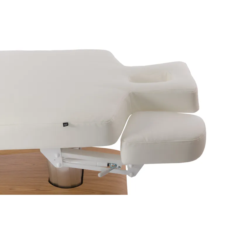 Camilla de spa de 4 motores que regulan la altura y la inclinación del respaldo, del reposapiés y de toda la camilla. Colchón de una única pieza con 3 secciones. Reposabrazos ajustables y cabezal con agujero facial. Estructura metálica con acabado de madera color natural. Acolchado ultrablando de gran confort con tapizado PU blanco de alta calidad. La base incluye un sistema de iluminación LED de colores intercambiables que puede adaptarse a cada centro. Portarrollos incorporado.