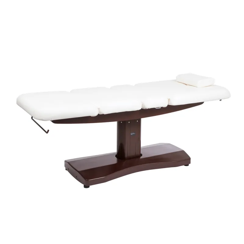 Camilla multifuncional de altas prestaciones equipada de 3 motores que controlan la altura, la inclinación del respaldo y del módulo central. Agujero facial y cojín reposacabezas. Estructura metálica en color marrón. Tapizado blanco en PU de alta calidad y fácil de limpiar.