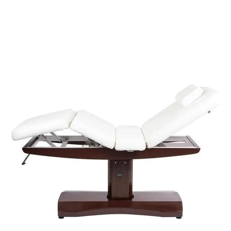 Camilla multifuncional de altas prestaciones equipada de 3 motores que controlan la altura, la inclinación del respaldo y del módulo central. Agujero facial y cojín reposacabezas. Estructura metálica en color marrón. Tapizado blanco en PU de alta calidad y fácil de limpiar.