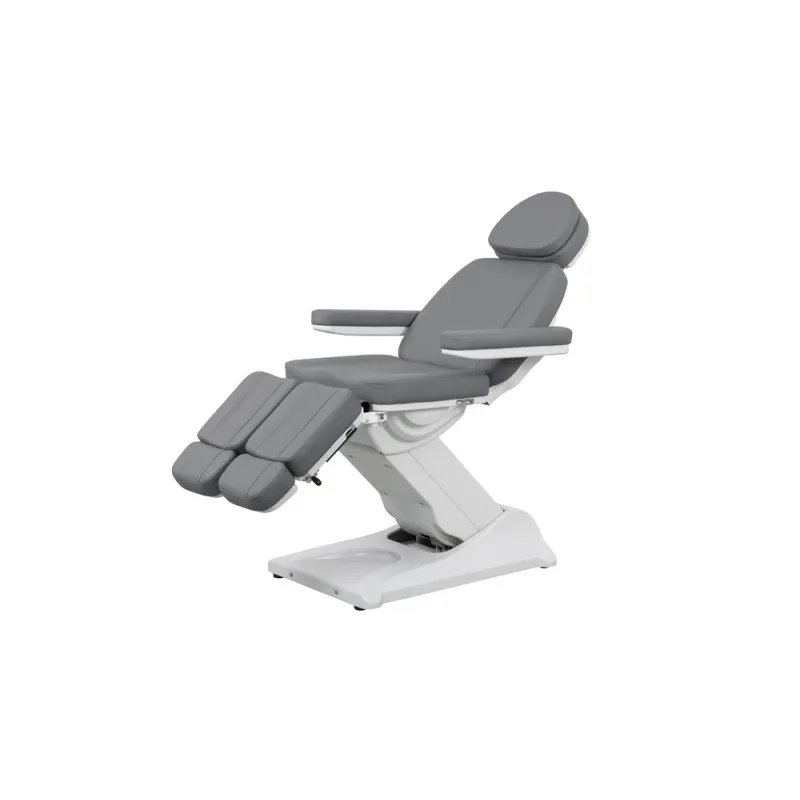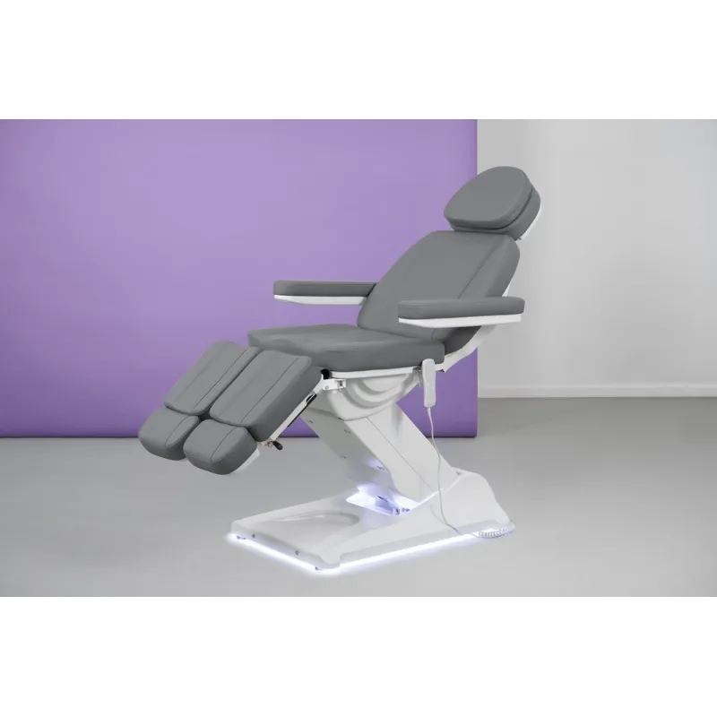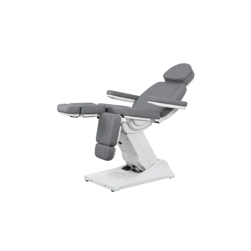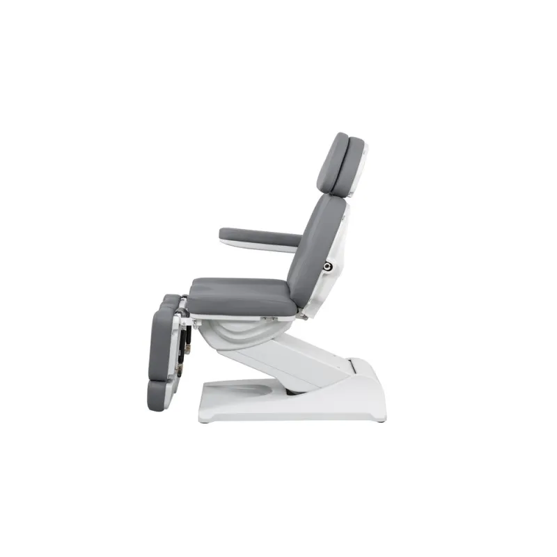 Sillón de podología equipado con 3 motores que controlan la altura, la inclinación del respaldo y del asiento. Reposapiés ajustables en altura independientemente mediante pistón de gas. Reposabrazos abatibles y reposacabezas regulable con agujero facial. Tapizado blanco en PU de alta calidad y fácil de limpiar.